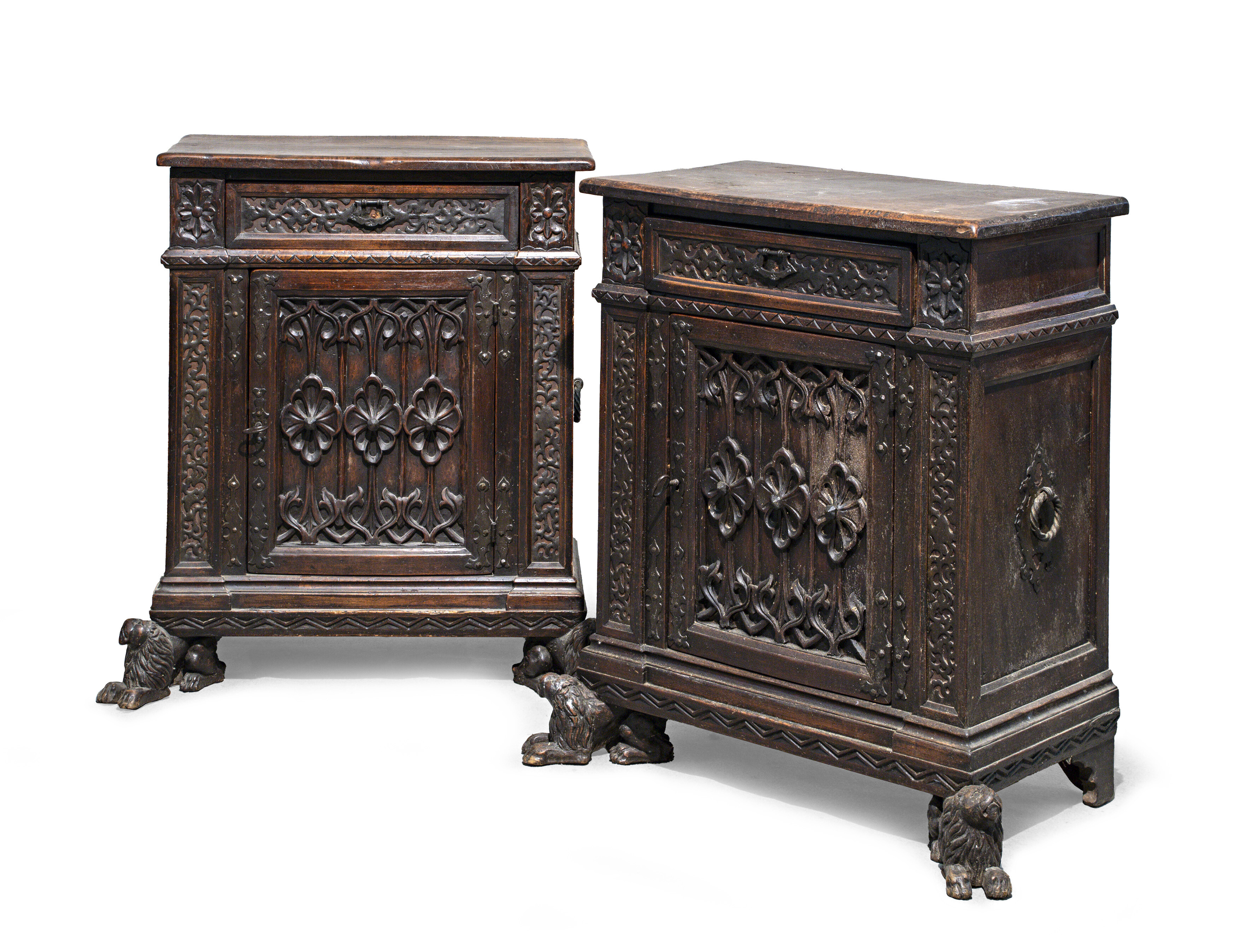 COPPIA PICCOLE CREDENZE LIGURIA XVIII SECOLO Coppia di credenzine in noce a patina scura, con cassetto ed anta centrali decorate a motivi floreali stilizzati. Serramenti e maniglie in ferro battuto, piedi ferini. Liguria, fine XVIII secolo. Difetti e mancanze. Misure cm 86 x 39 x 70