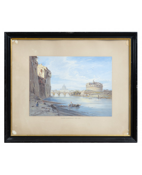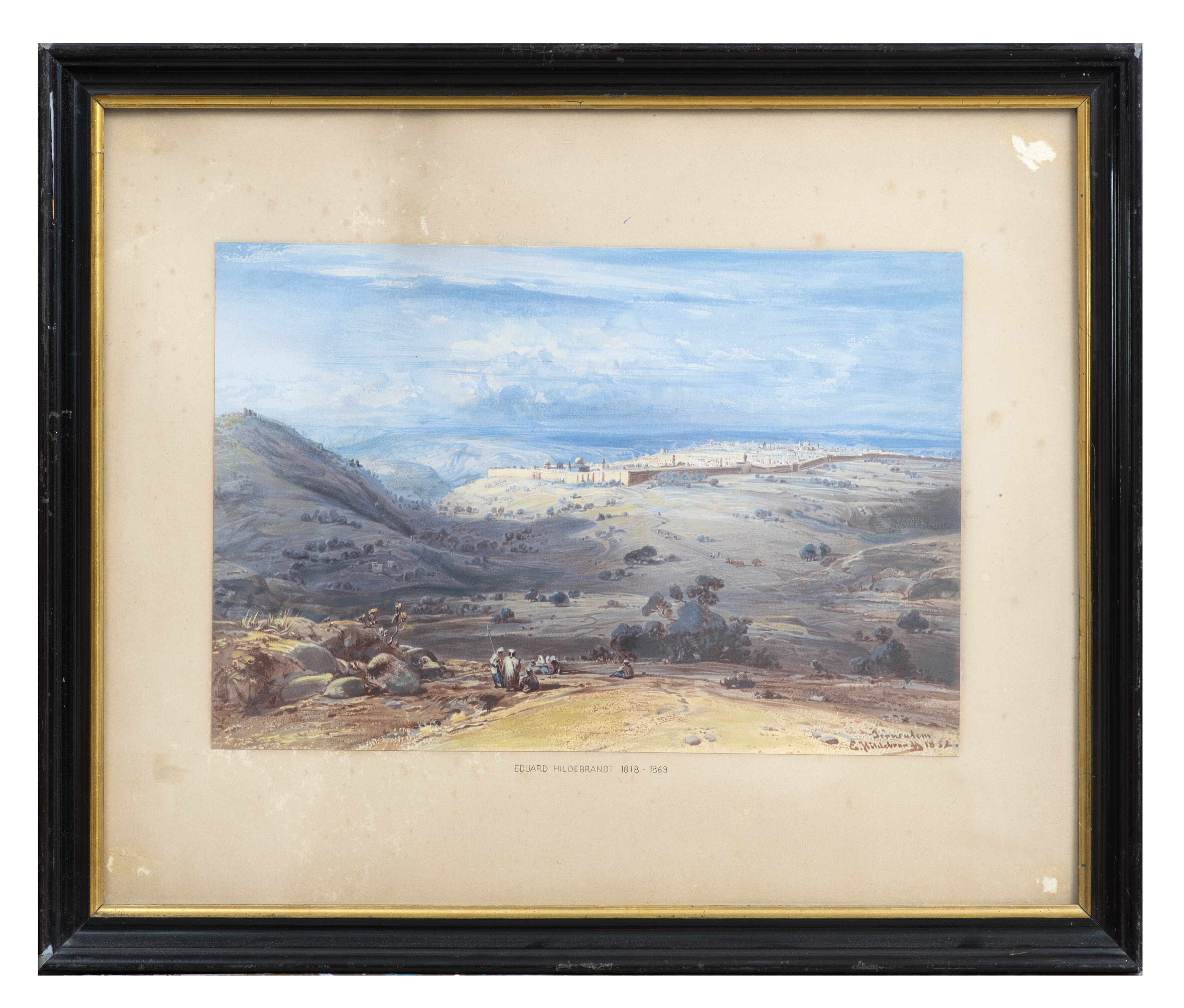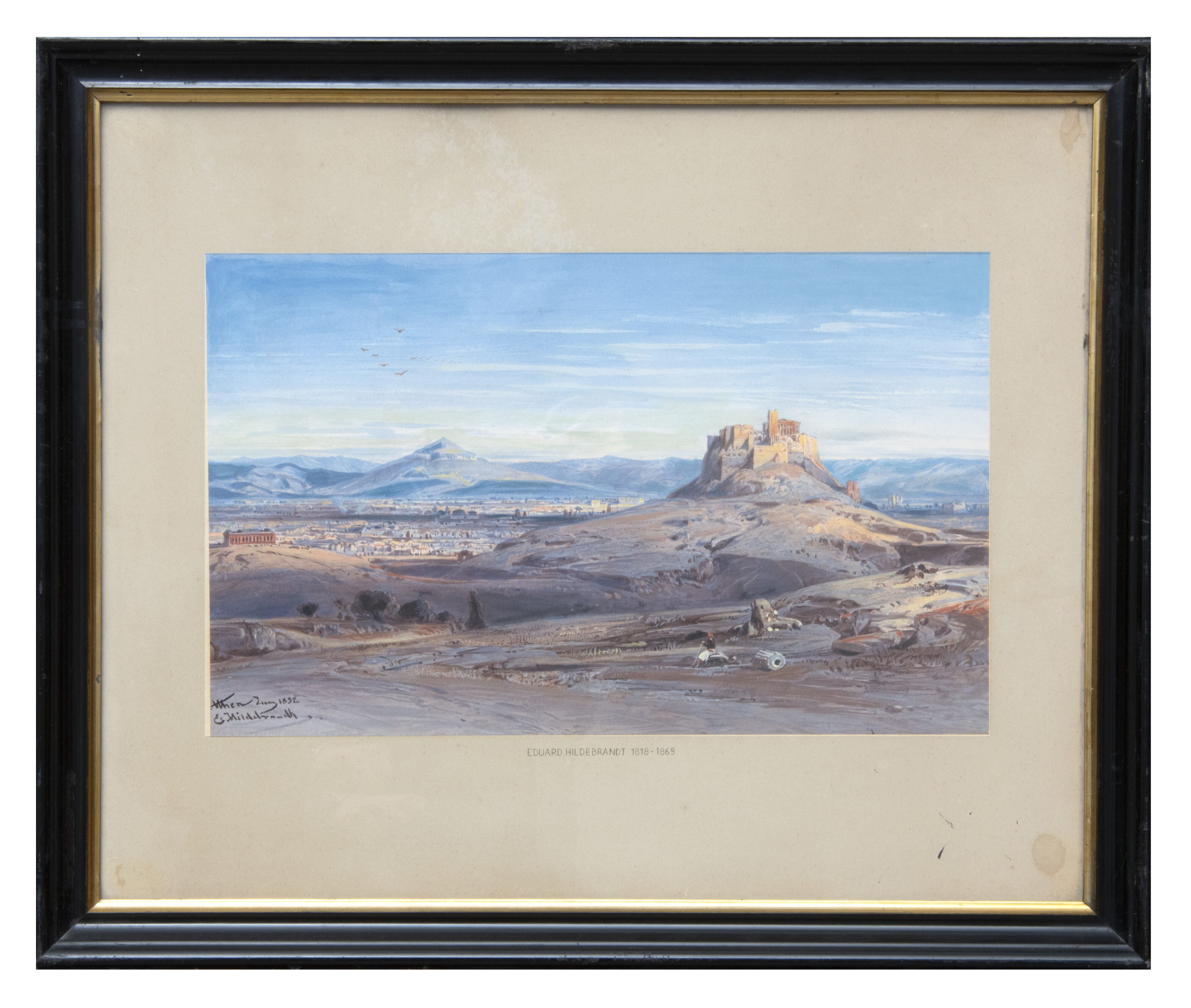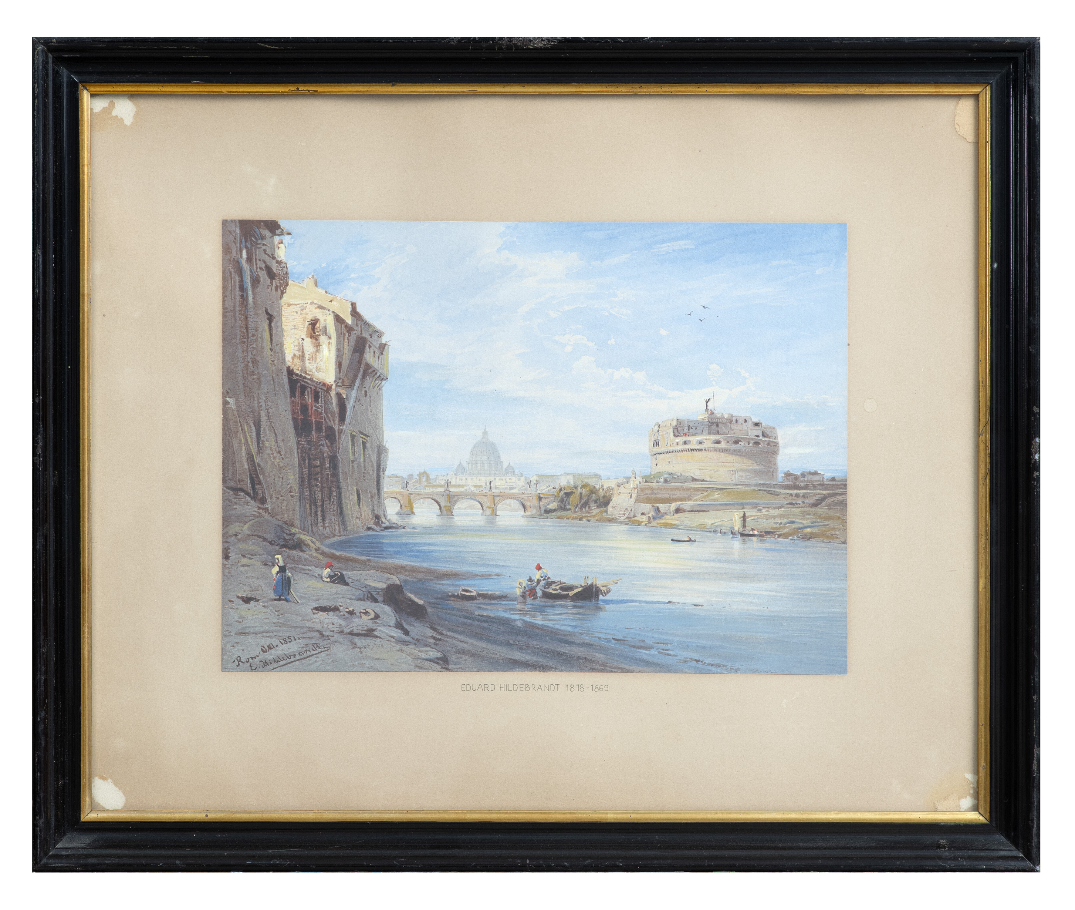 TRE RIPRODUZIONI DA EDUARD HILDEBRANDT (1818-1863) raffiguranti veduta araba, il Tevere a Castel Sant'Angelo e veduta di Atene. Misure cm. 28 x 42. In cornice.
