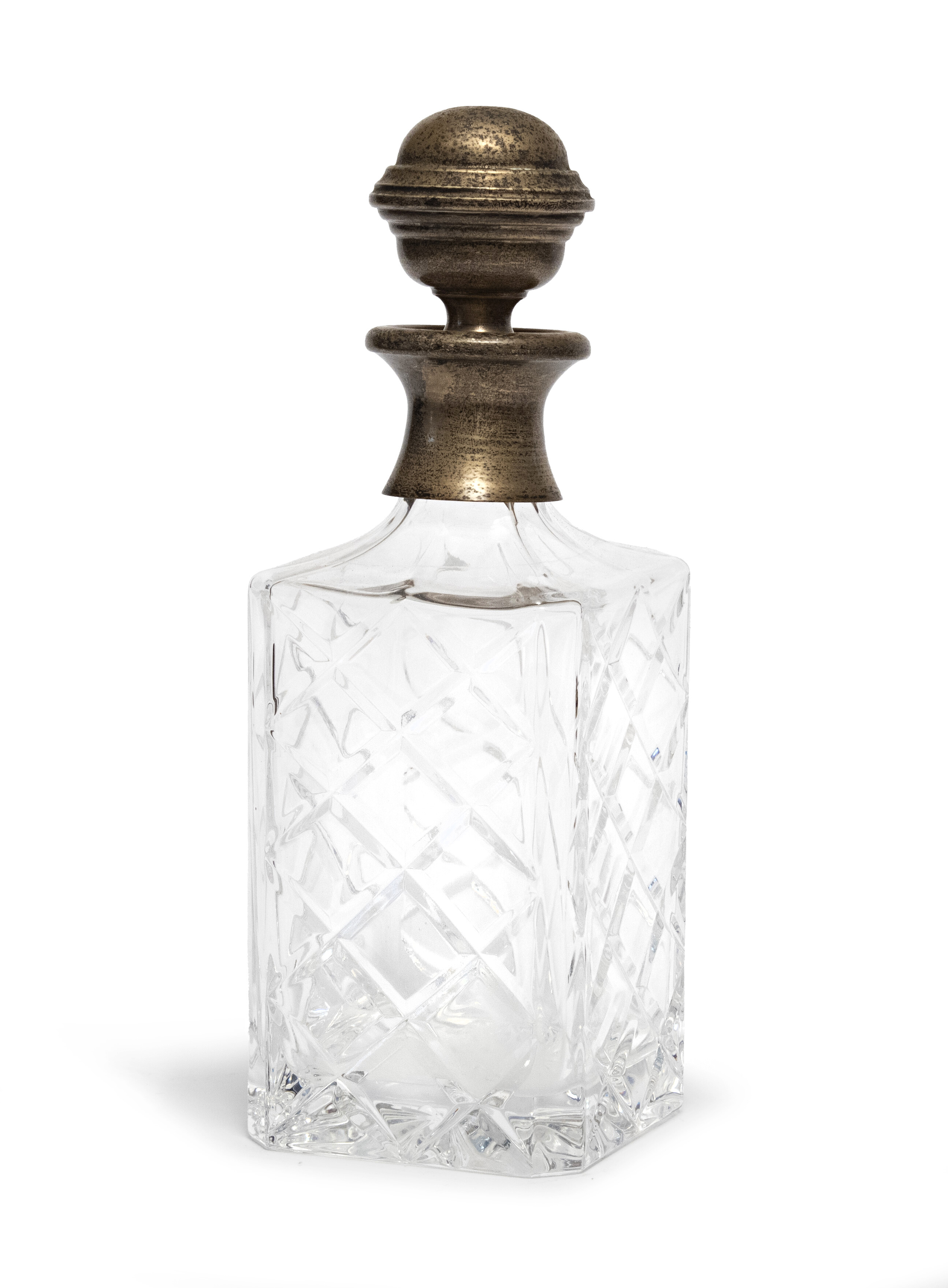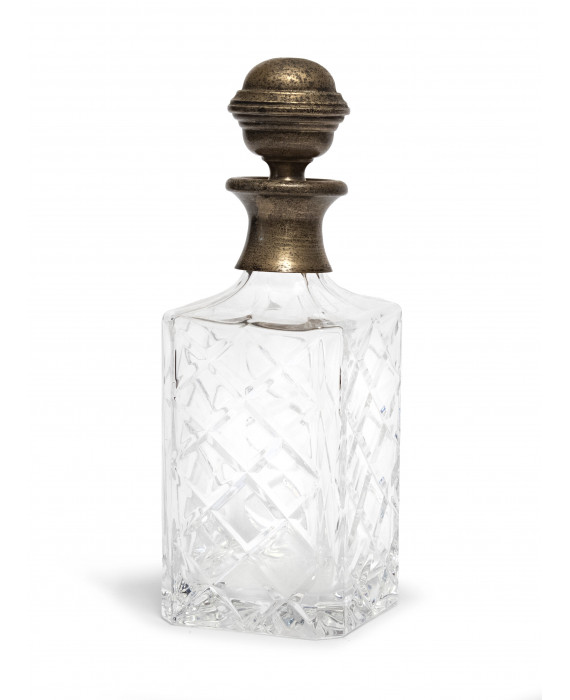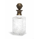 BOTTIGLIA DA LIQUORE, XX SECOLO in cristallo tagliato a reticolo e tappo in argento. Titolo 800/1000. Misure cm. 28 x 10 x 10.