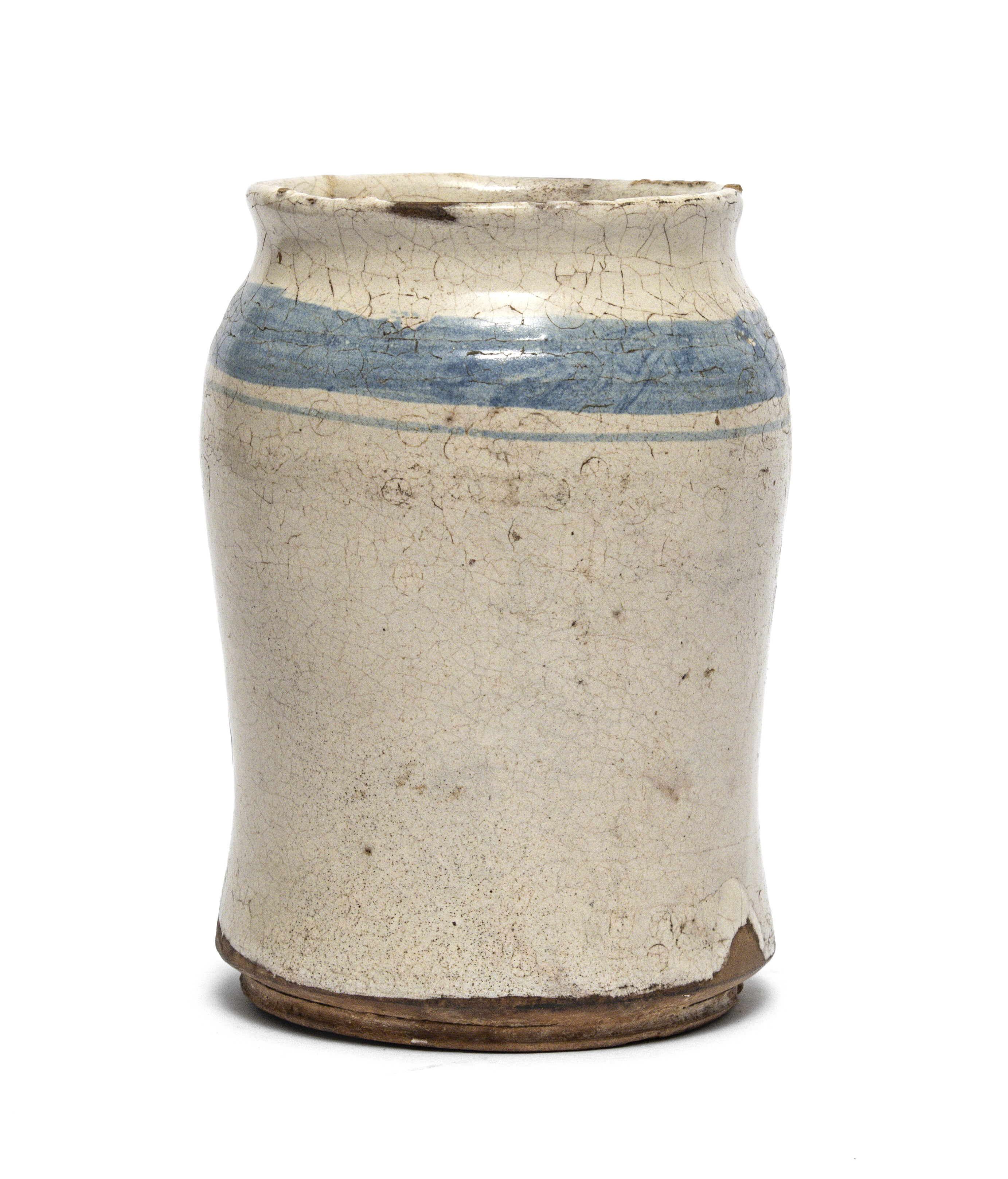 VASO IN TERRACOTTA, PUGLIE XIX SECOLO a smalto bianco con decoro in azzurro alla spalla. Misure cm. 18 x 12.
