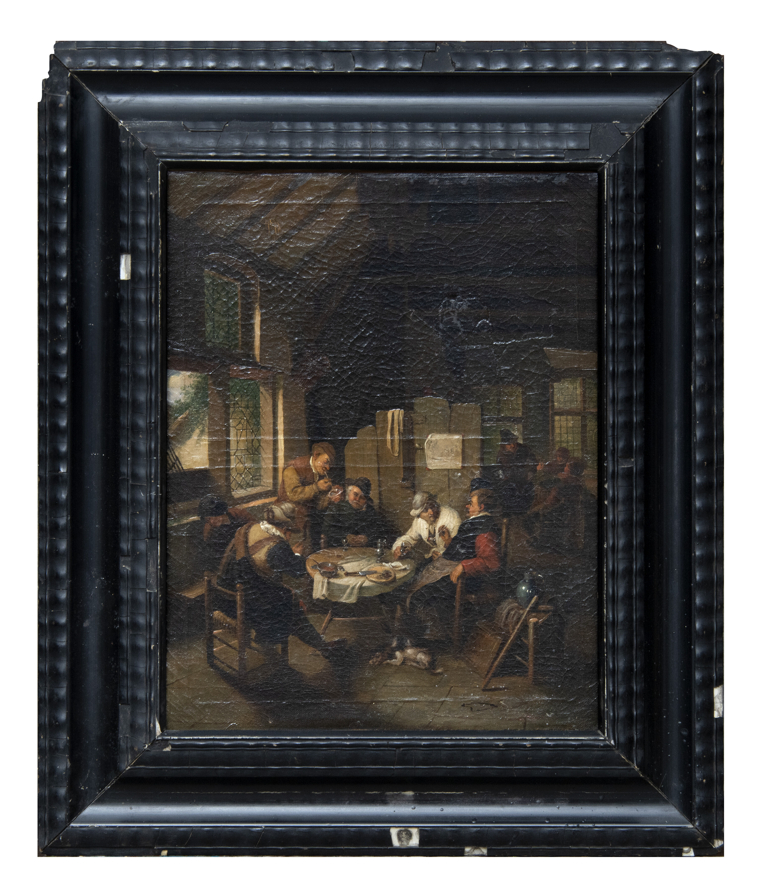 PITTORE OLANDESE, XIX SECOLO INTERNO DI LOCANDA CON BEVITORI Olio su tela, cm. 40,5 x 32,5 Scritta in basso a destra su una tavola: Ostade 1663 PROVENIENZA Collezione privata romana CONDITION REPORT Rintelo novecentesco. Taglio restaurato a destra sulla parete CORNICE Cornice olandese in legno ebanizzato, del XIX secolo