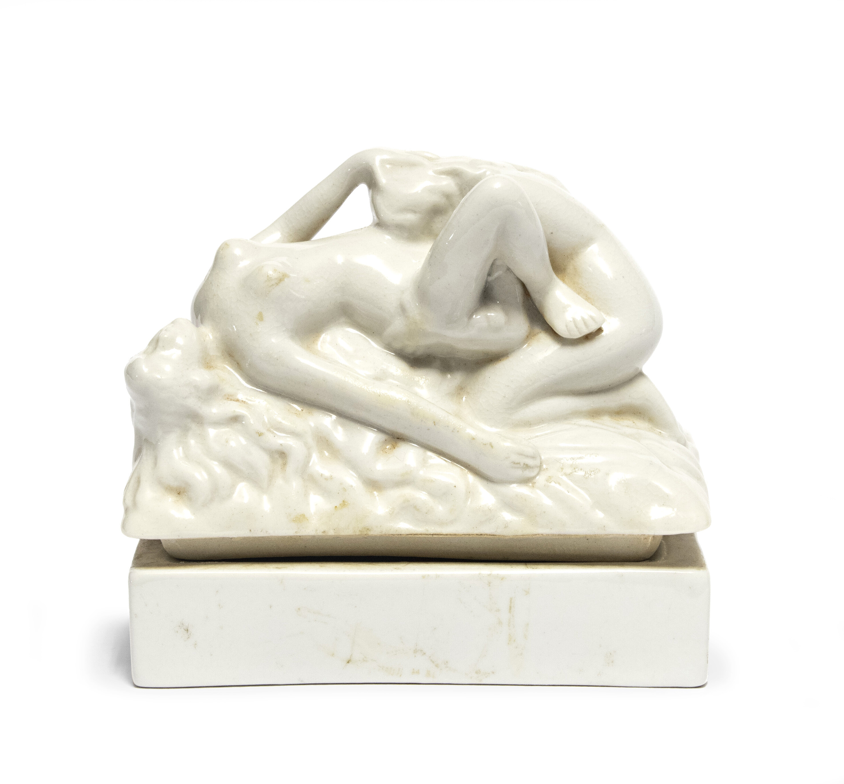 SCATOLA IN PORCELLANA, INIZI XX SECOLO con decoro al coperchio a scena erotica. Marca sotto la base. Misure cm. 11 x 11 x 7.