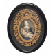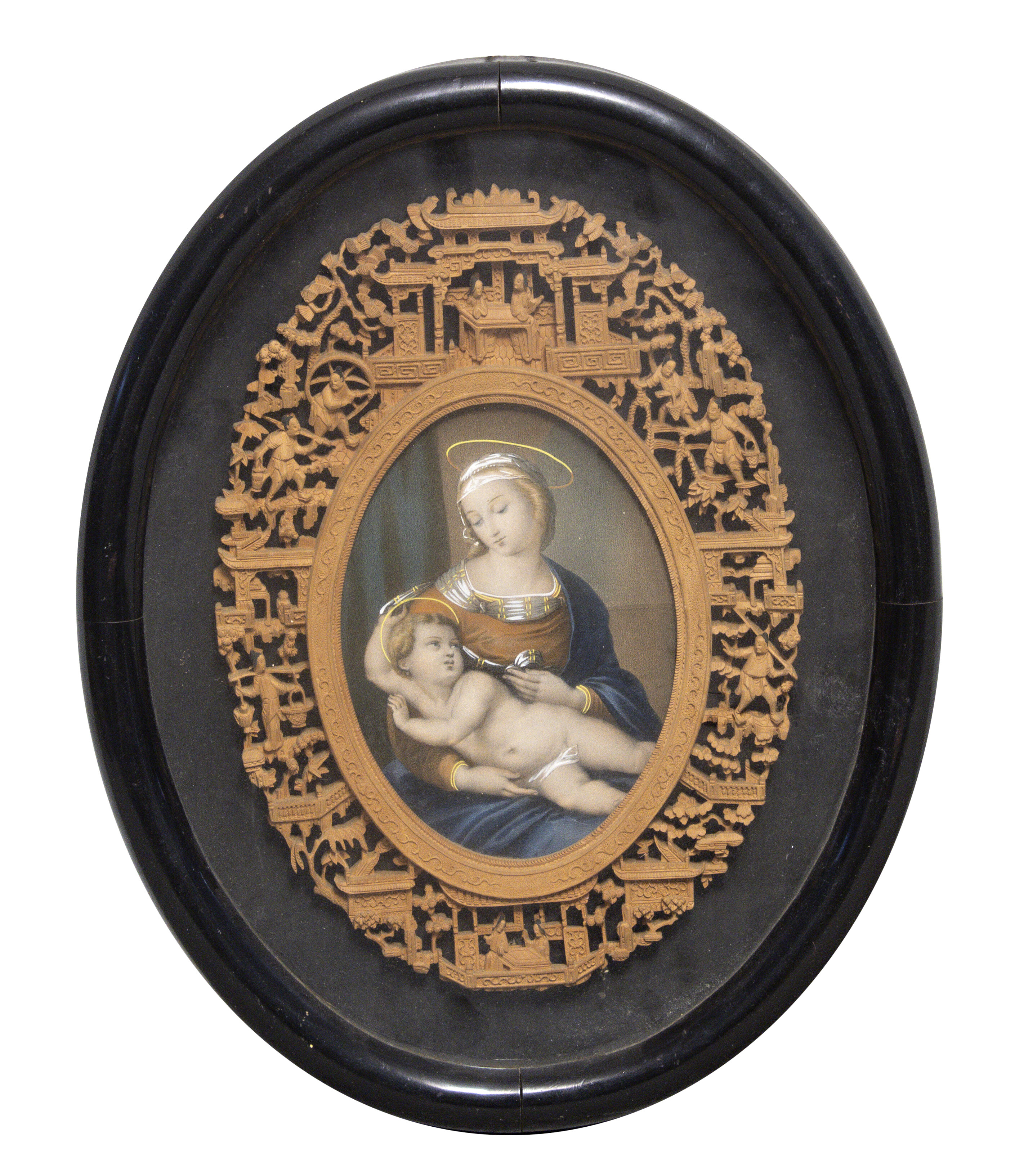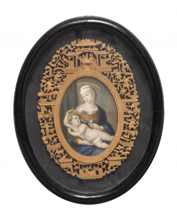 CORNICE IN BOSSO, CINA INIZI XX SECOLO a sezione ovale scolpita a scene di vita quotidiana. All'interno riproduzione raffigurante Vergine col Bambino. In teca con cornice ebanizzata. Luce cornice in bosso, cm. 17 x 12.