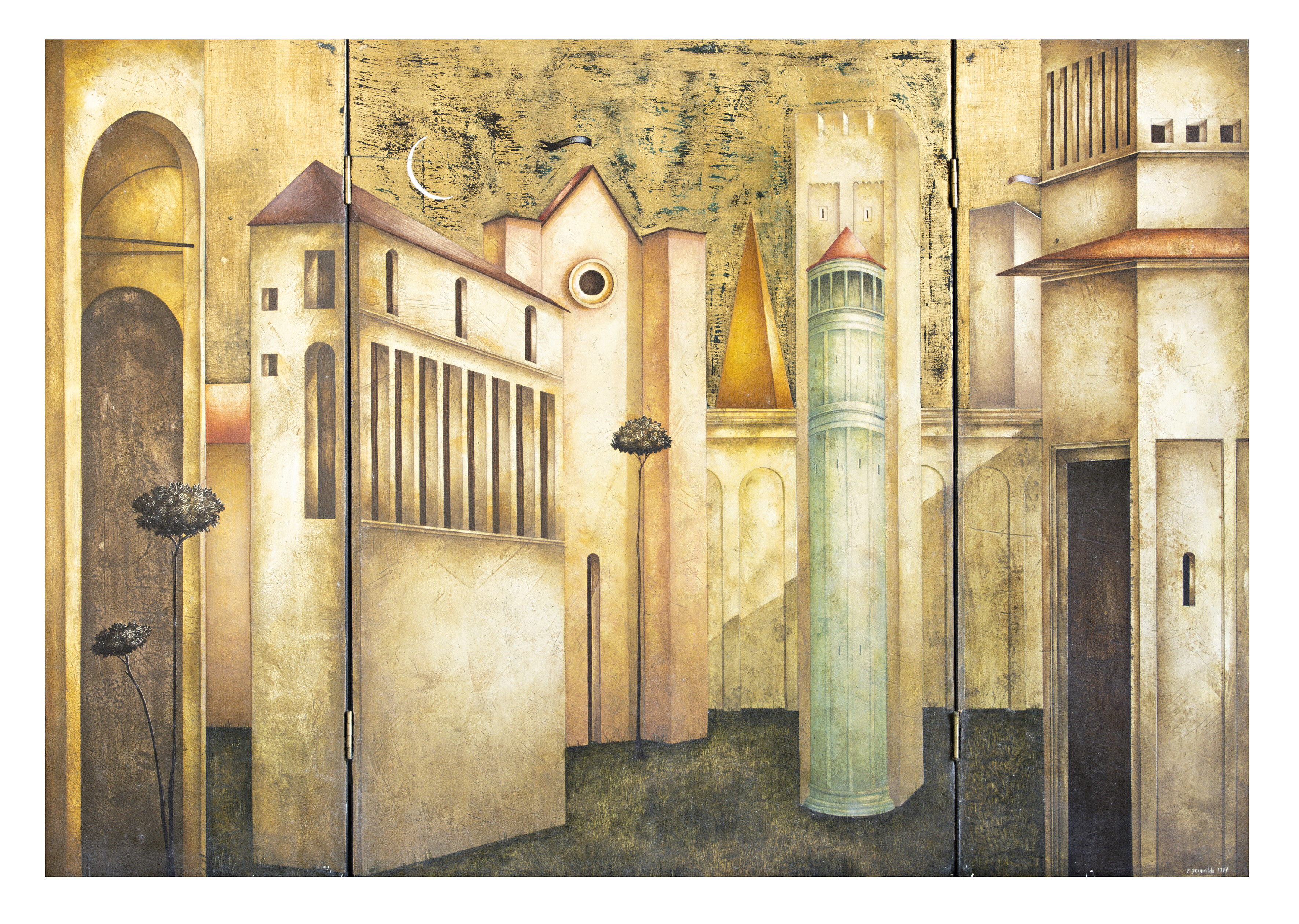 PAOLO GRIMALDI ( XX secolo) SCORCIO CITTA' IMMAGINARIA MEDIEVALE Trittico a tempera ed olio su tavola a fondo oro, cm. 69,5 x 99,5. Firma in basso a destra nel terzo pannello di destra Al retro descrizione dell'opera data 1997 Paolo Grimaldi
