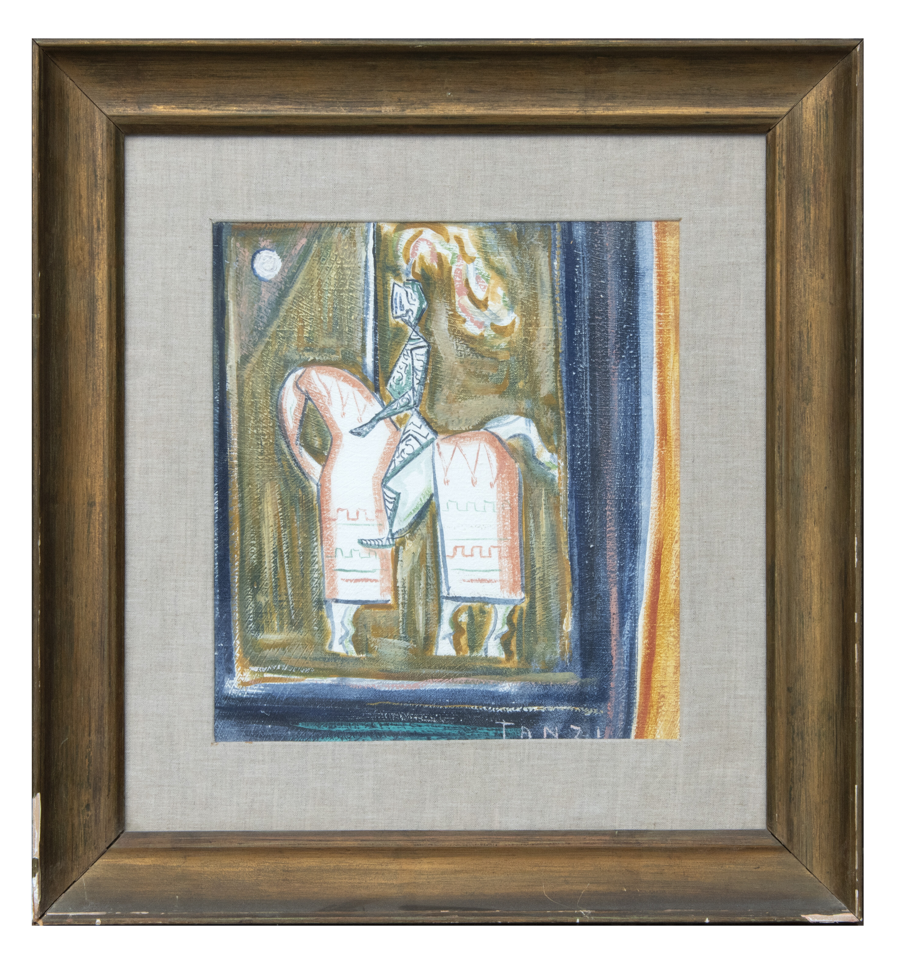 GAETANO TANZI (Genova 1918 - 2017) Cavaliere teatrale, 1969 Olio su tavoletta, cm. 35 x 30 Firma in basso a destra Firma e, data e titolo al retro In cornice
