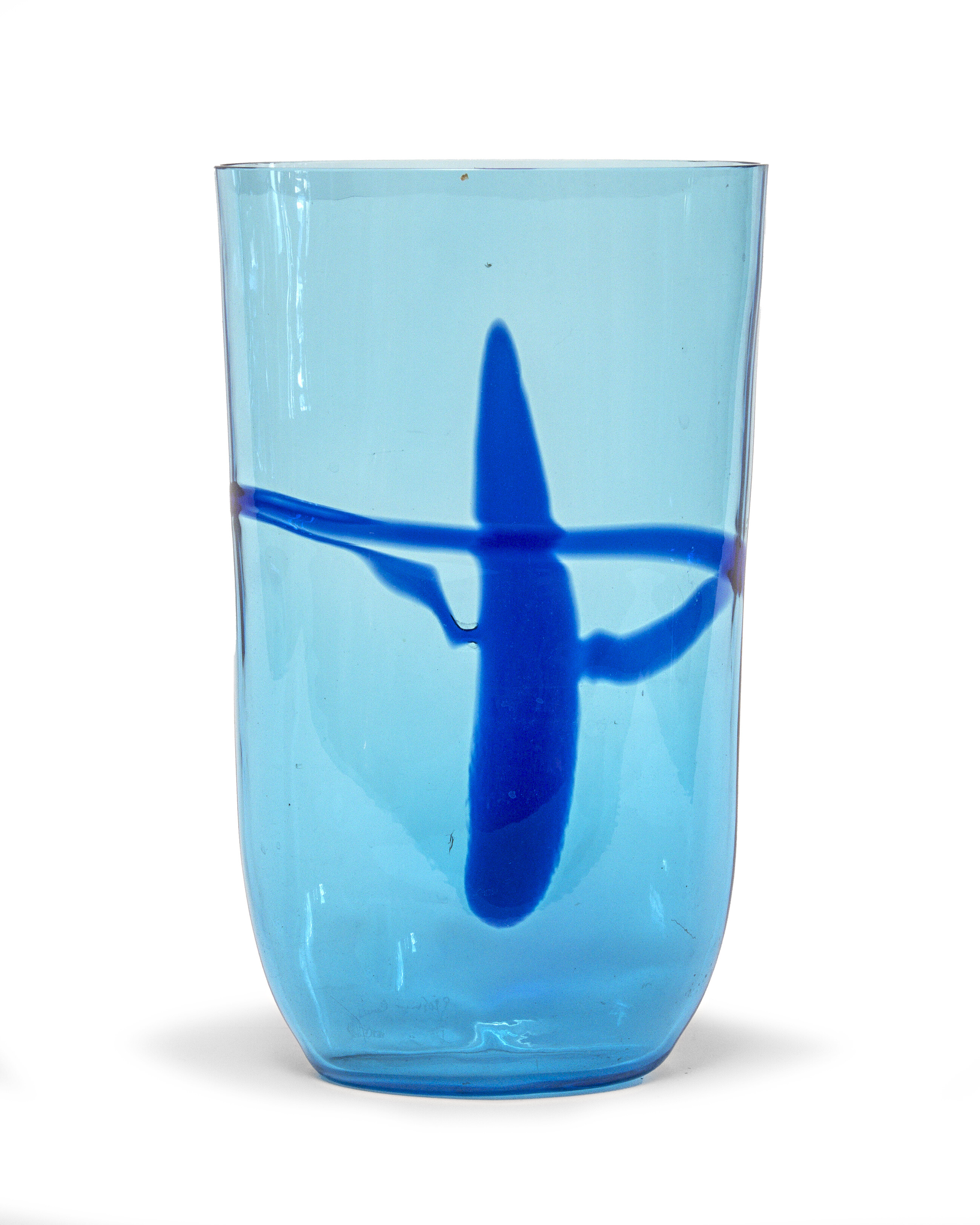 VASO IN VETRO, GIOVANNI CENEDESE ANNI '70 a fondo blu con inserto in pasta di vetro cobalto. Firma incisa e etichetta 'Cenedese', alla base. Misure cm. 31 x 19 x 14.