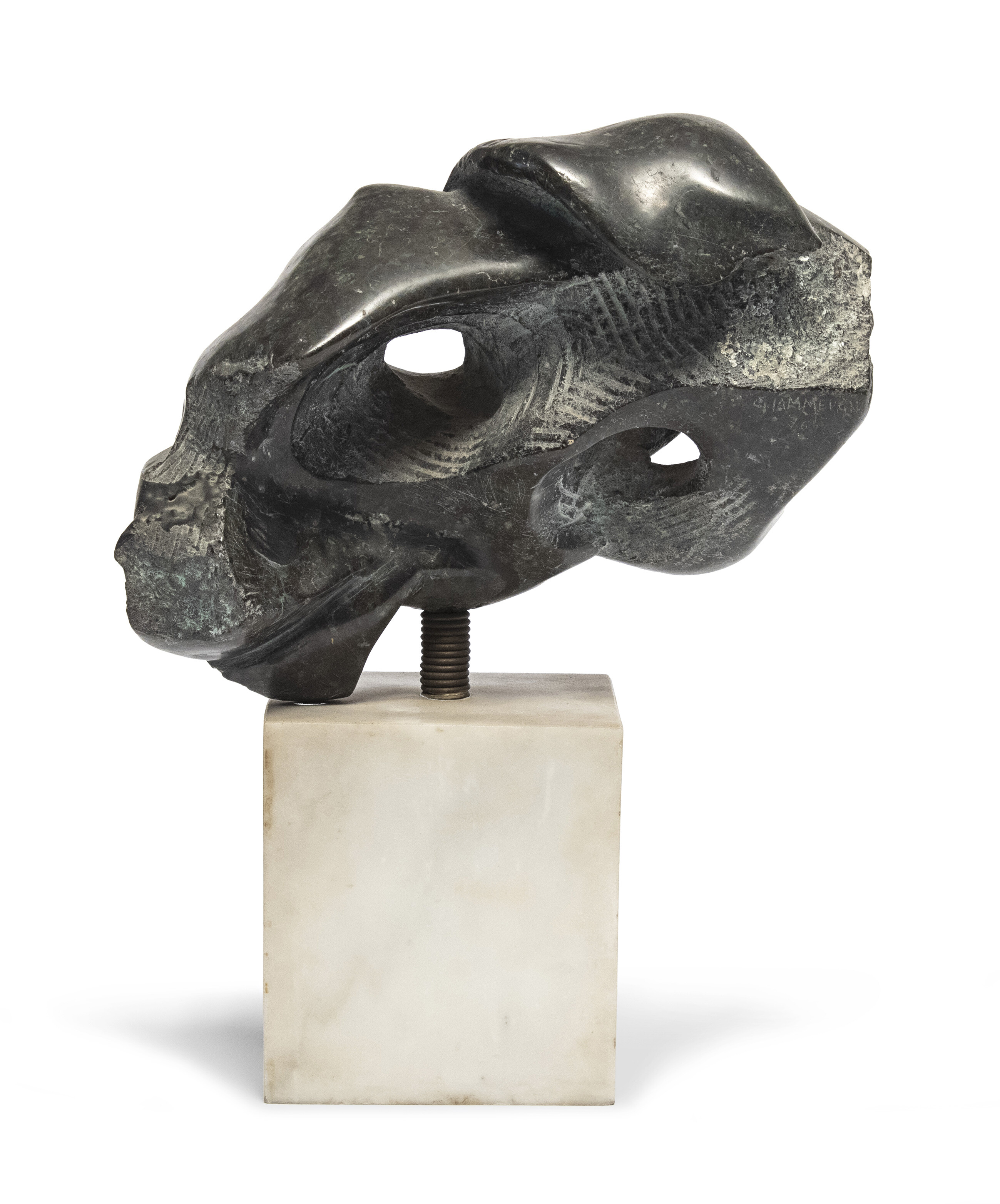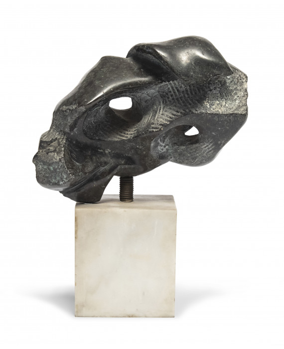 SCULTORE XX SECOLO Senza titolo Scultura in marmo verde, cm. 18 x 21 x 11 Firma incisa al retro, di difficile lettura Base in marmo bianco
