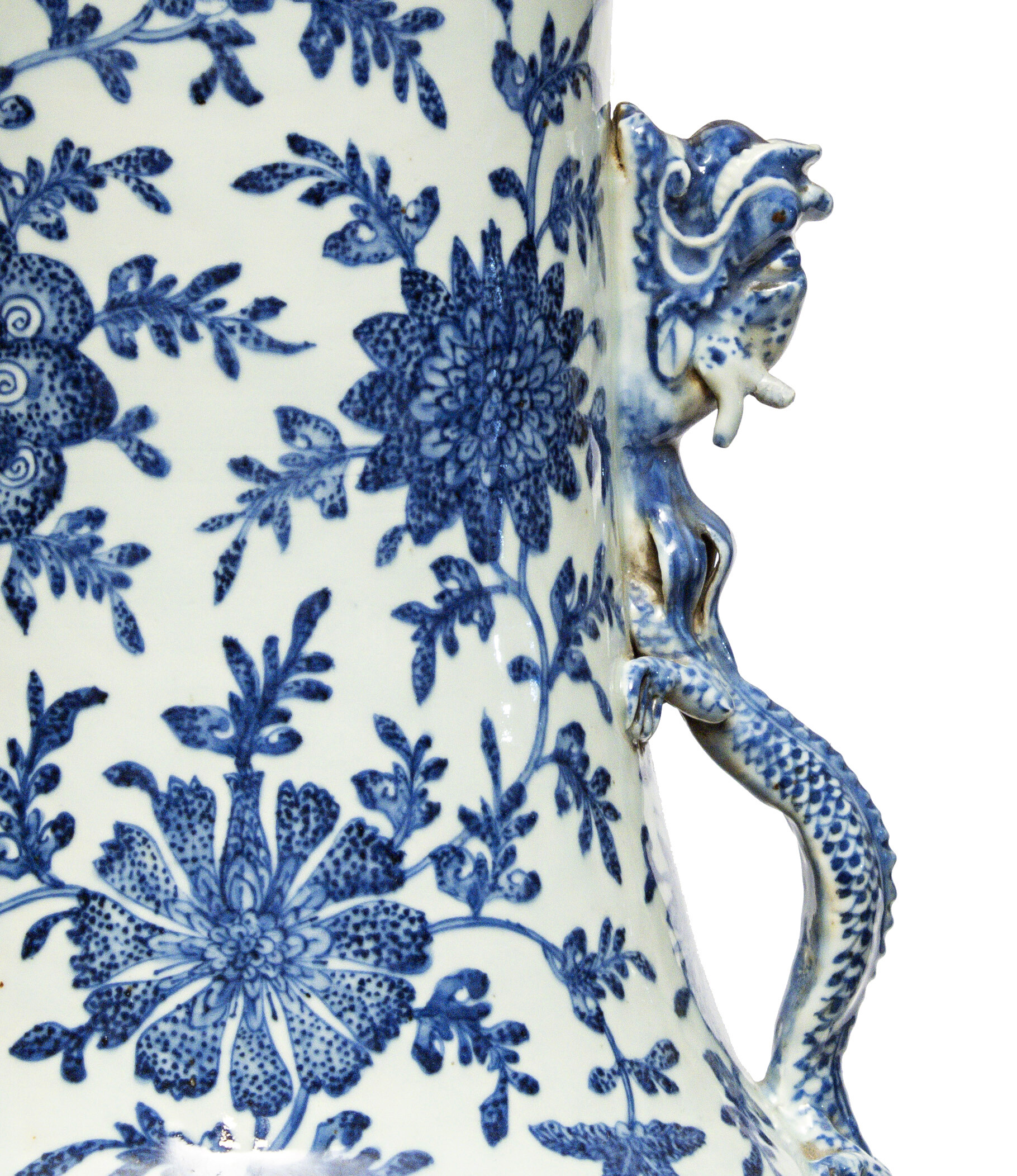 SPLENDIDO VASO IN PORCELLANA, CINA XIX SECOLO interamente a smalto bianco e blu, con decori a tralci di pesco in fiore e ornati vegetali. Anse a ramarri fantastici. Misure cm. 93 x 40. PROVENIENZA Famiglia romana