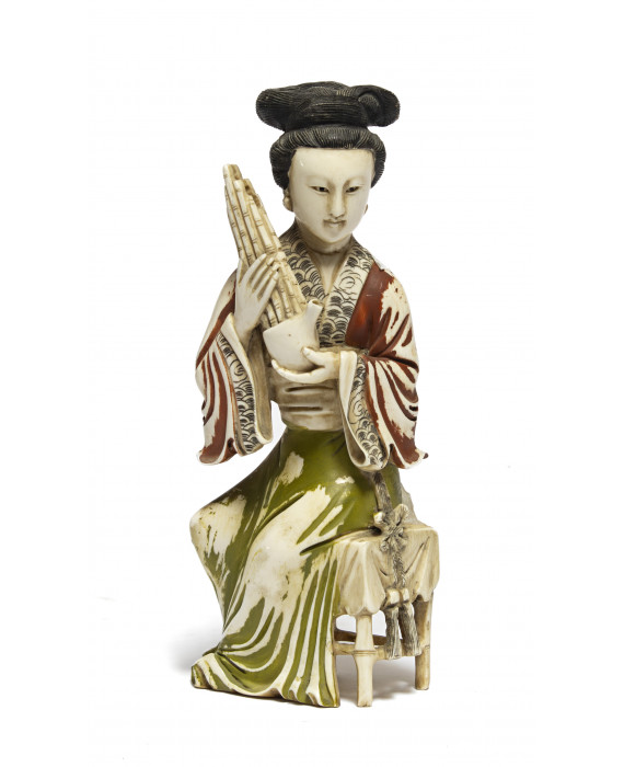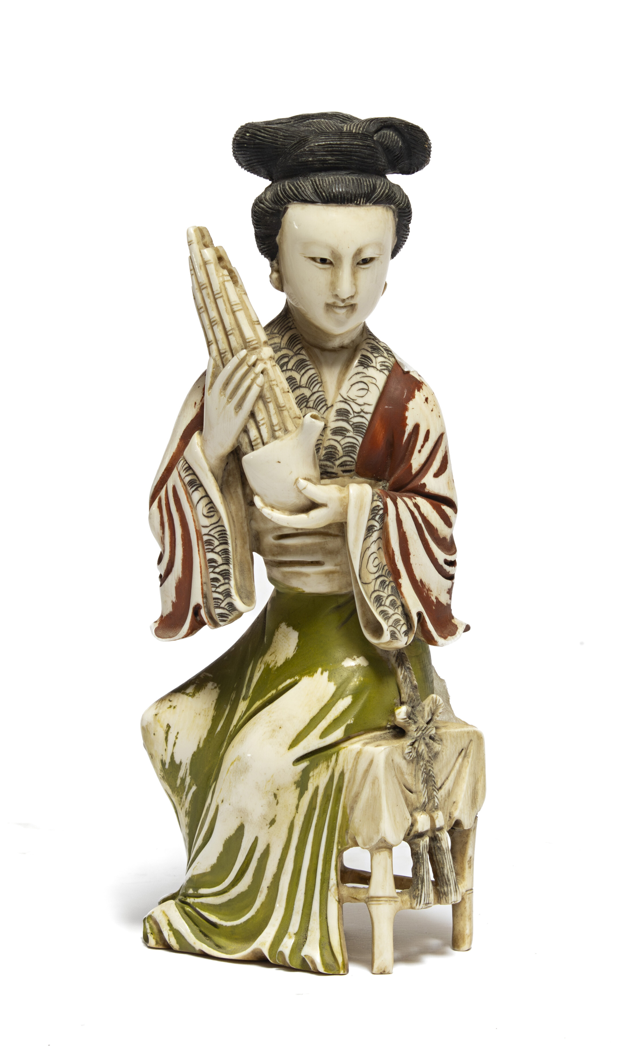 Free bidSCULTURA IN AVORIO, CINA DINASTIA QING con resti di laccatura policroma, raffigurante un musicante seduto. Misure cm. 20 x 8 x 5. Certificato CITES Certificato di antichità del Prof. Stefano Liberati