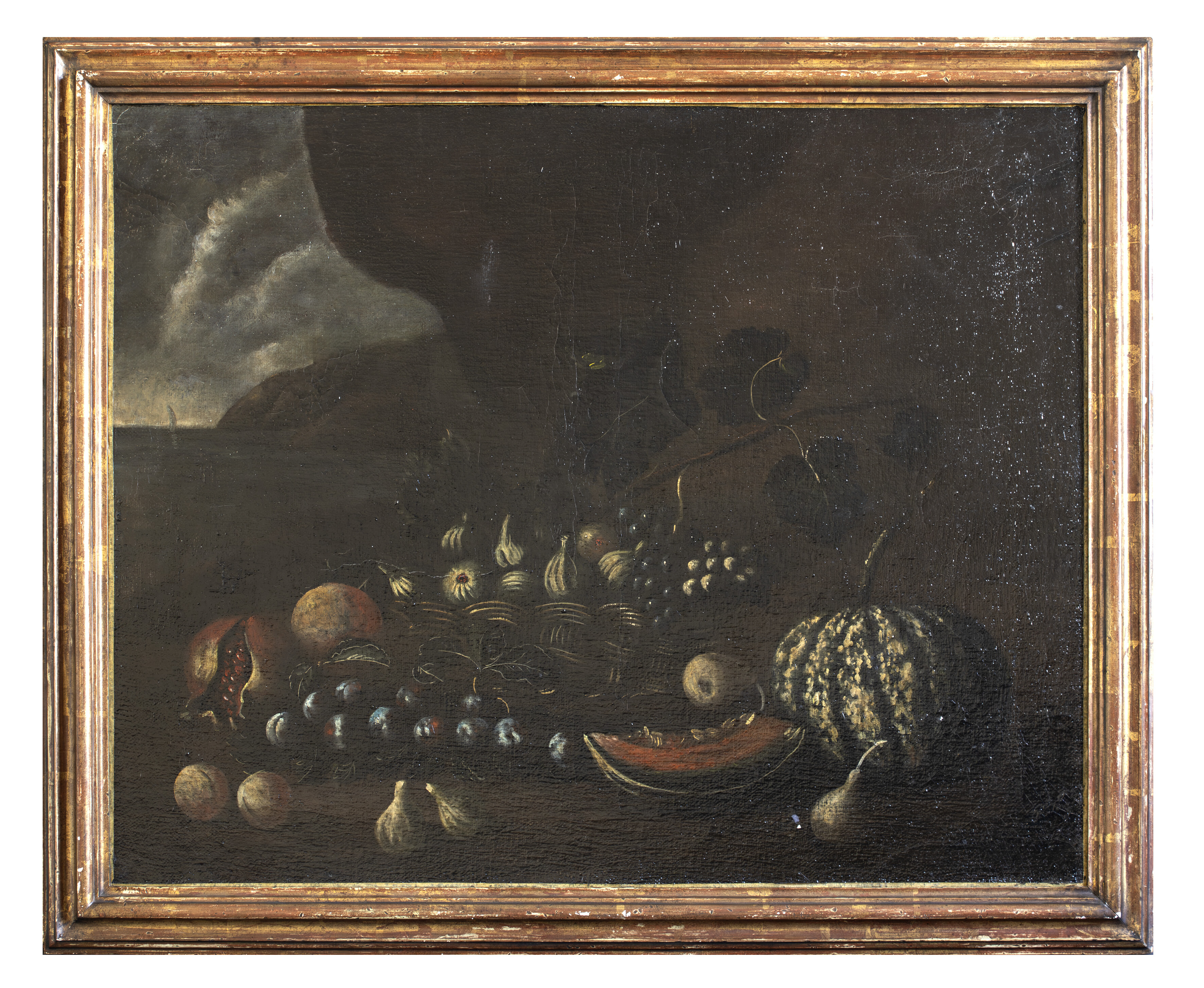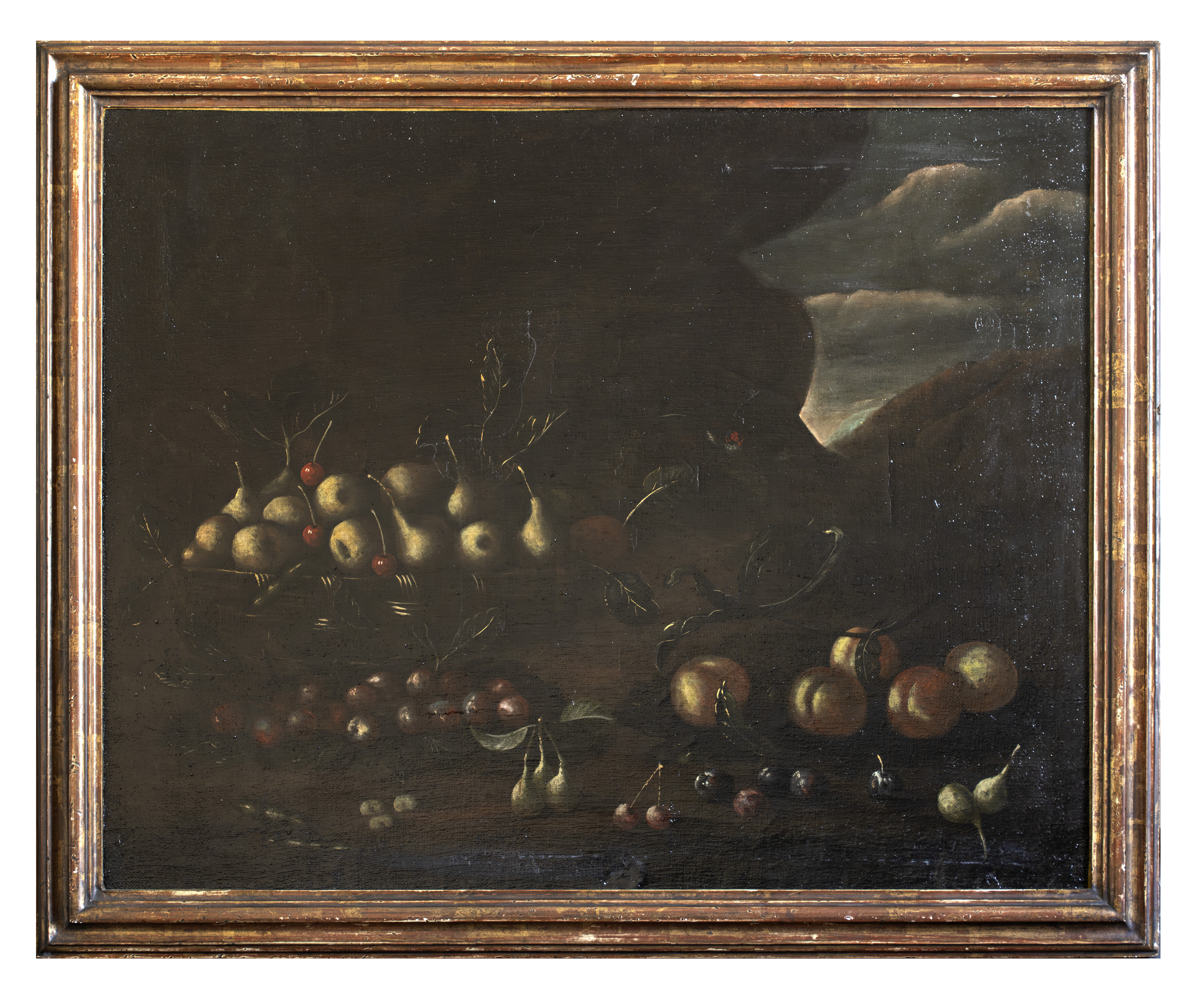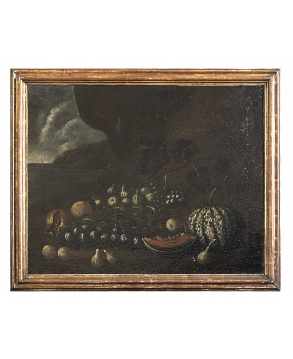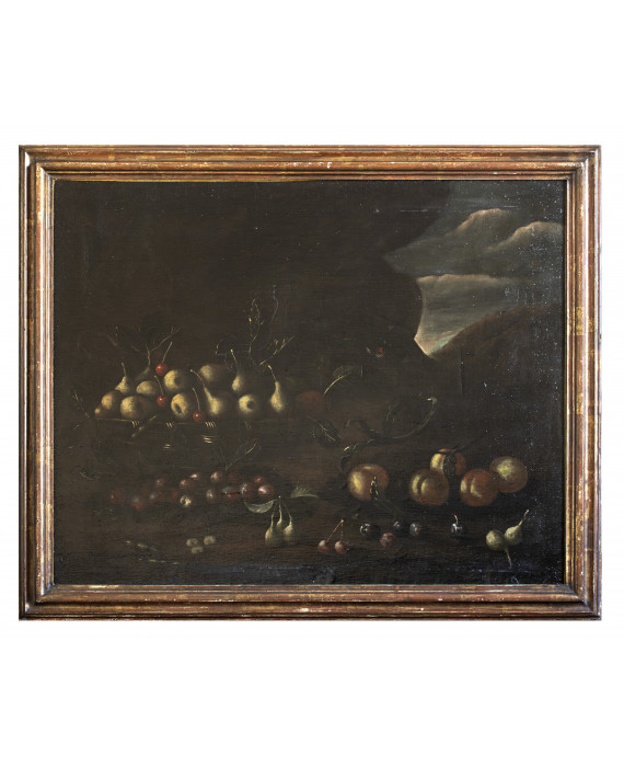 PITTORE NAPOLETANO, SECONDA META’XVII SECOLO PAESAGGIO CON NATURA MORTA DI FRUTTA E CESTA IN VIMINI CON PERE E CILIEGIE PAESAGGIO CON NATURA MORTA DI FRUTTA E CESTA DI VIMINI CON FICHI Coppia di dipinti ad olio su tela, cm. 80,5 x 100 PROVENIENZA Collezione romana CONDITION REPORT Rintelo recente,restauri sparsi