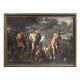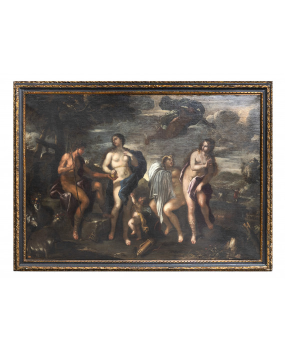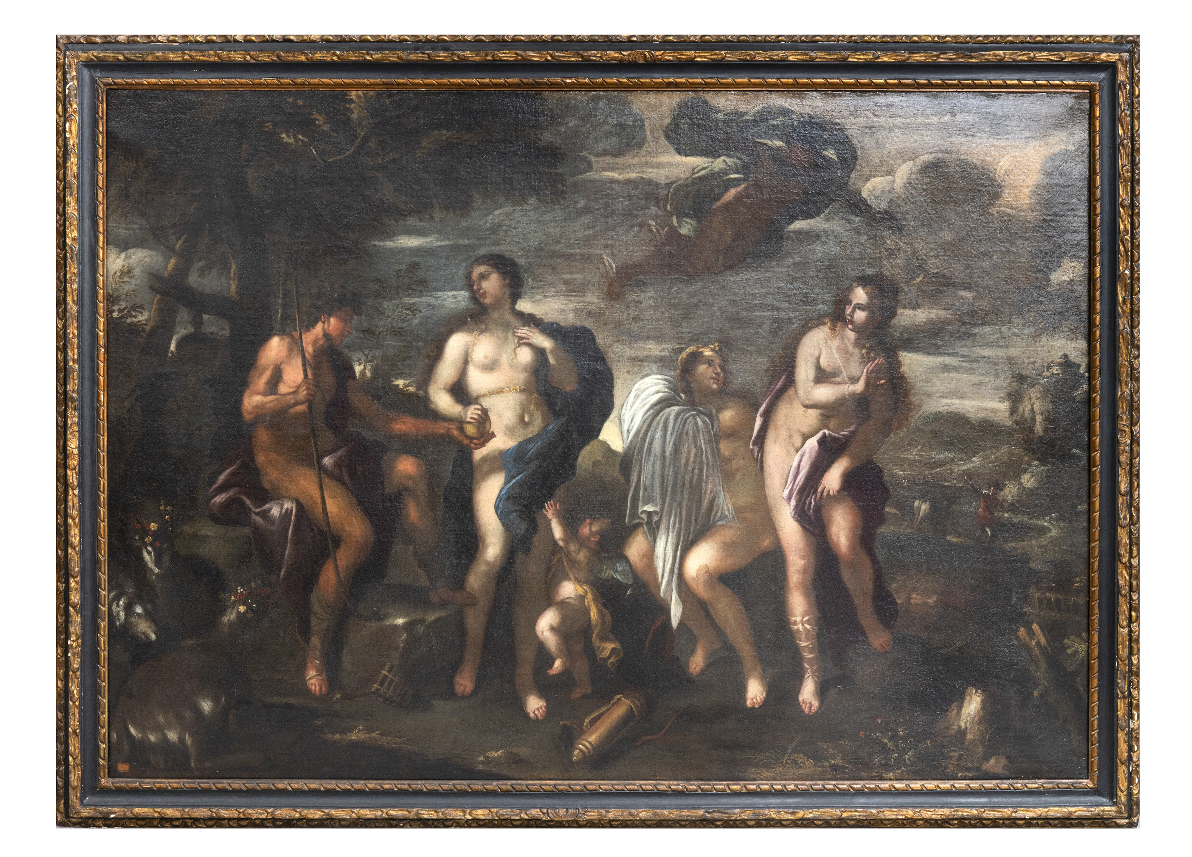 LUCA GIORDANO, bottega (Napoli 1634 - 1705) IL GIUDIZIO DI PARIDE Olio su tela, cm. 126 x 176 PROVENIENZA Famiglia napoletana Il soggetto mitologico narrato nel poema epico Cypria (VII secolo a.C.) fu replicato con varianti sia da Luca Giordano, sia dagli allievi. Le versioni realizzate dal maestro negli anni ottanta del XVII secolo suggeriscono uno spunto, nell’impaginazione della scena, derivante dallo stesso soggetto dipinto da Pieter Paul Rubens tra il 1638 - 39, custodito a Madrid, Museo del Prado, La versione custodita a Vicenza, Musei Civici, è una delle testimonianze della rielaborazione del Giordano sul tema Rubensiano. (bibliografia di riferimento: Luca Giordano 1634 - 1705, cat. Mostra, Napoli, 2001, p.42) Il dipinto in questione, a nostro parere ascrivibile all’entourage di Luca Giordano, costituisce una delle diverse repliche con piccole varianti, realizzata da uno o più pittori gravitanti all’interno della bottega CONDITION REPORT Restauri diffusi, zone con svelature CORNICE Cornice in legno a lacca nera e oro, della fine del XIX secolo