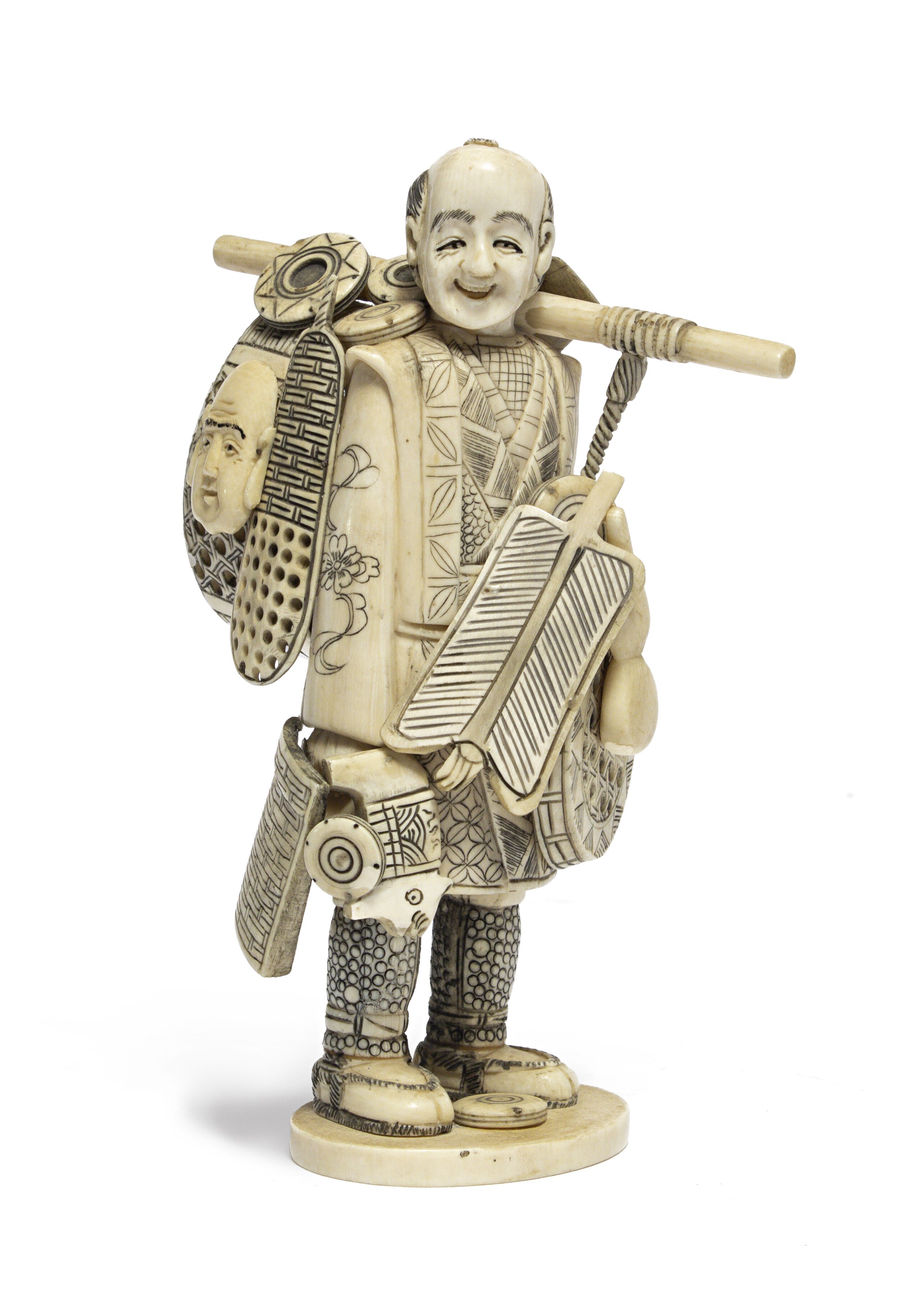 OKIMONO IN AVORIO, GIAPPONE PERIODO MEIJI raffigurante il venditore ambulante Marca sotto la base. Misure cm. 17 x 8 x 11. Difetti. Certificato CITES Certificato di antichità del Prof. Stefano Liberati