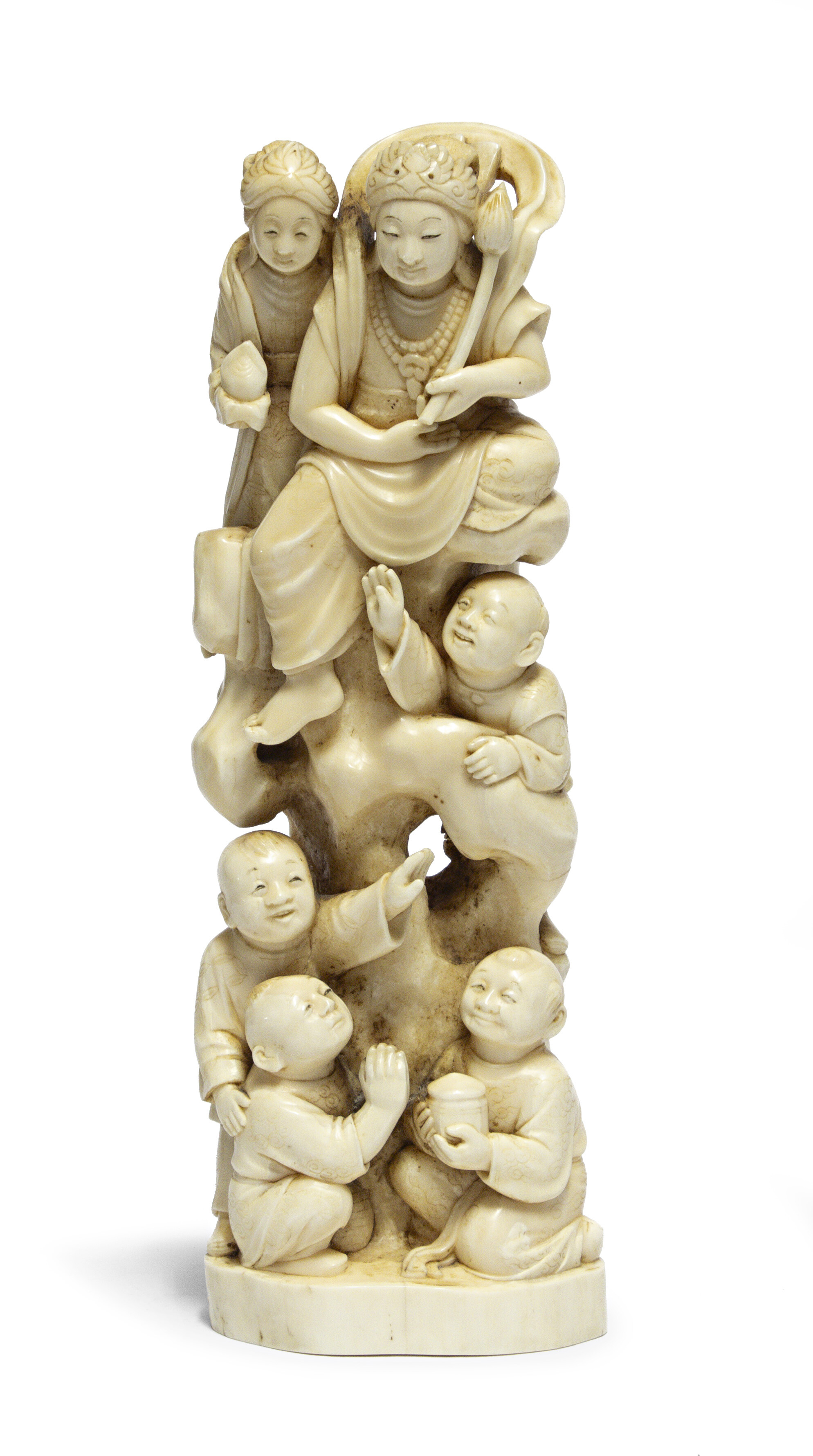 SCULTURA IN AVORIO, CINA INIZIO XX SECOLO raffigurante Budai con Ruyi e folla di bambini. Marca incisa sotto la base. Misure cm. 26 x 9 x 6,5. Certificato CITES Certificato di antichità del Prof. Stefano Liberati