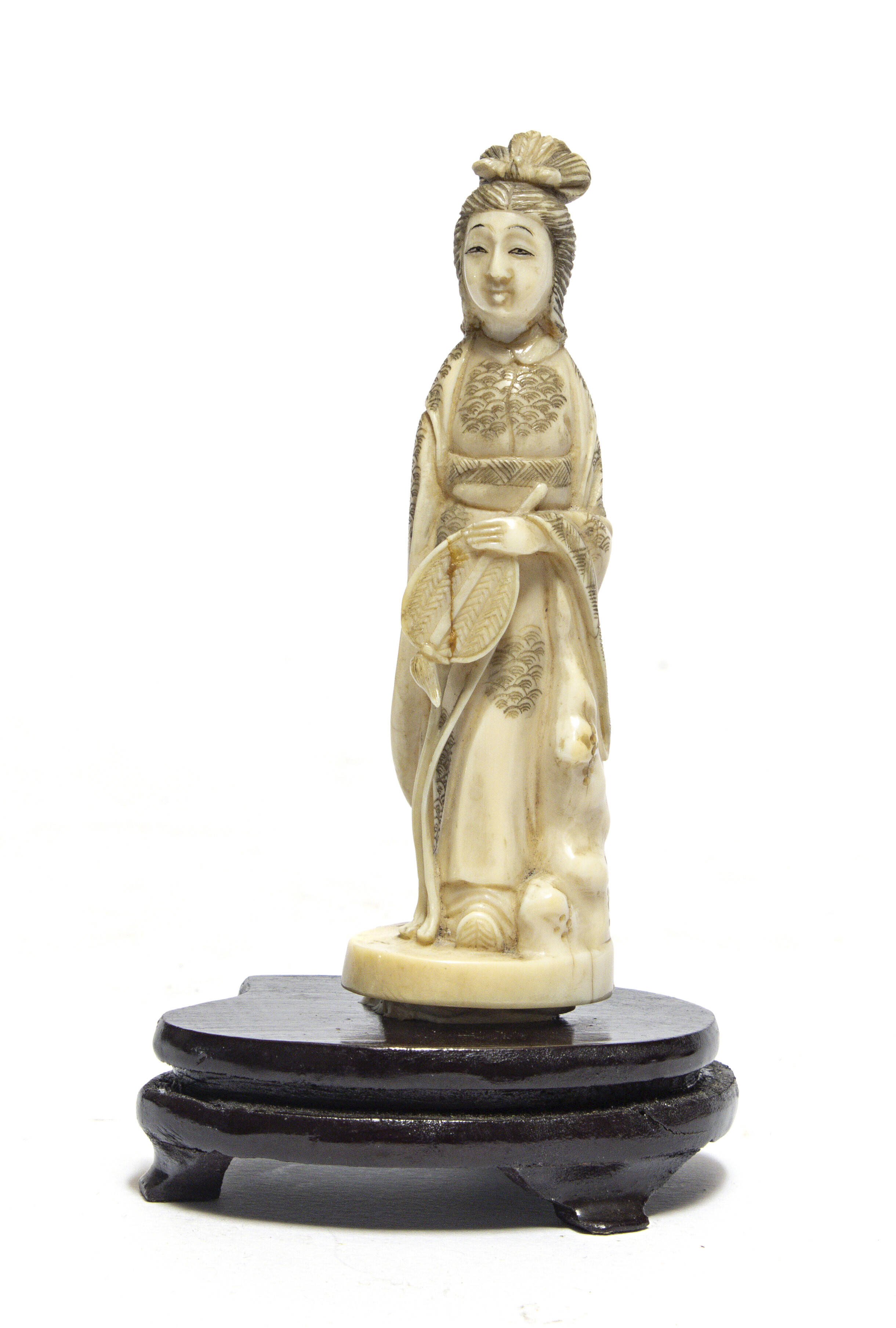 SCULTURA IN AVORIO, CINA FINE XIX SECOLO raffigurante una Quienyin in posa tradizionale. Base in legno di teak. Misure cm. 13 x 4 x 4. Certificato CITES Certificato di antichità del Prof. Stefano Liberati