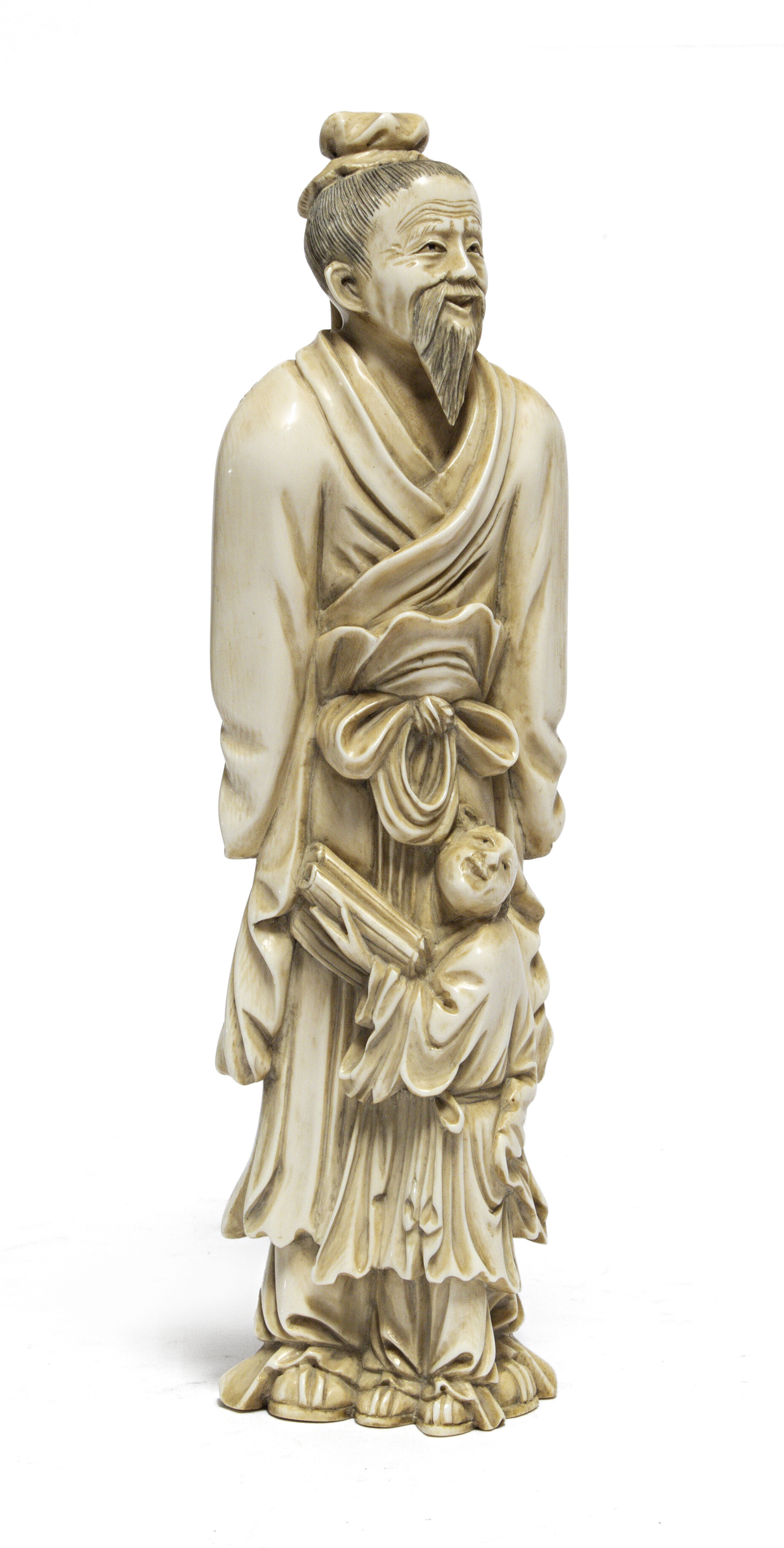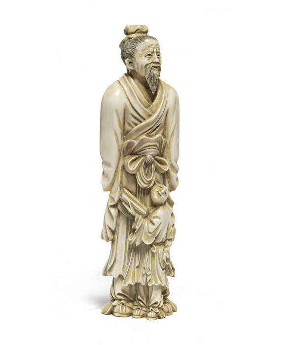 SCULTURA IN AVORIO, CINA INIZI XX SECOLO raffigurante San-Xing con un bambino. Misure cm. 28 x 8 x 7. Certificato CITES Certificato di antichità del Prof. Stefano Liberati