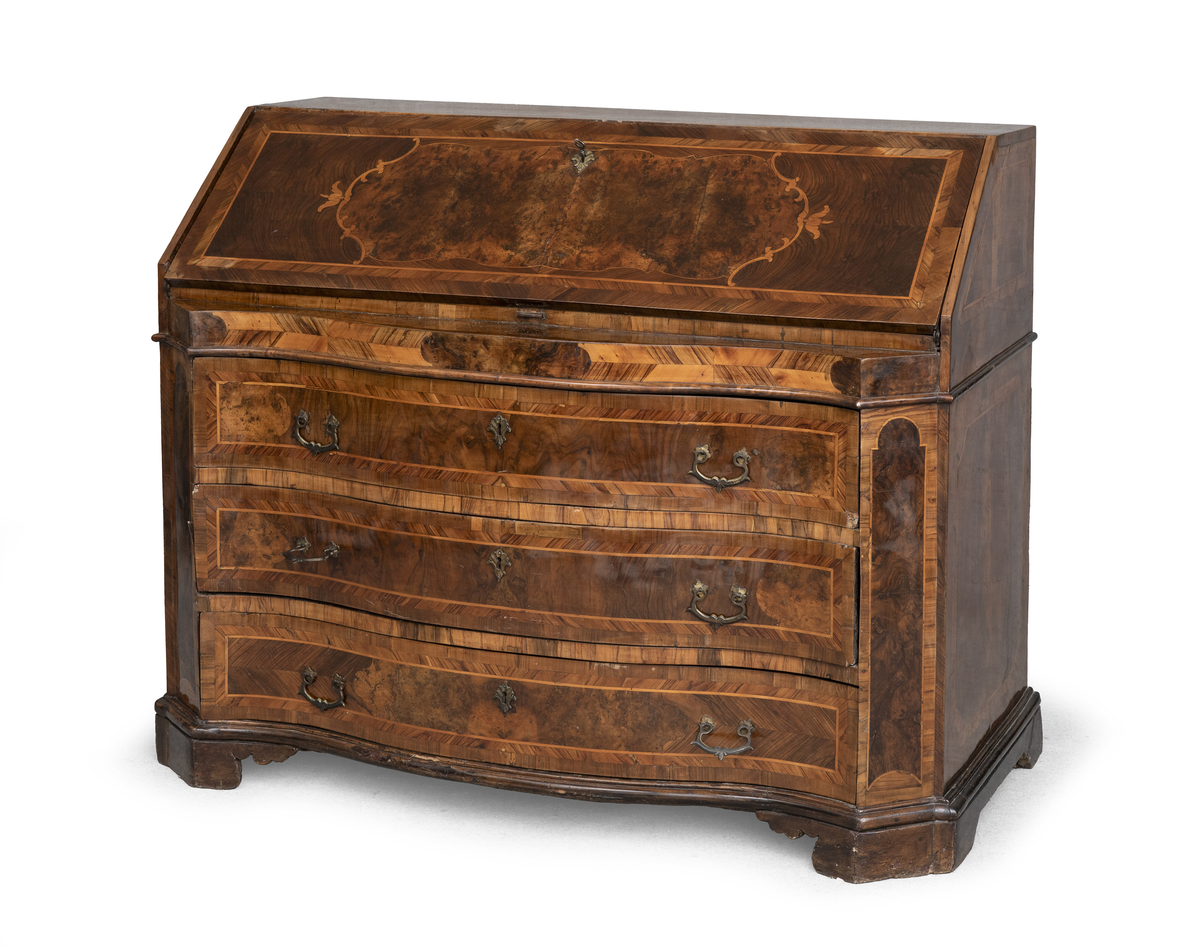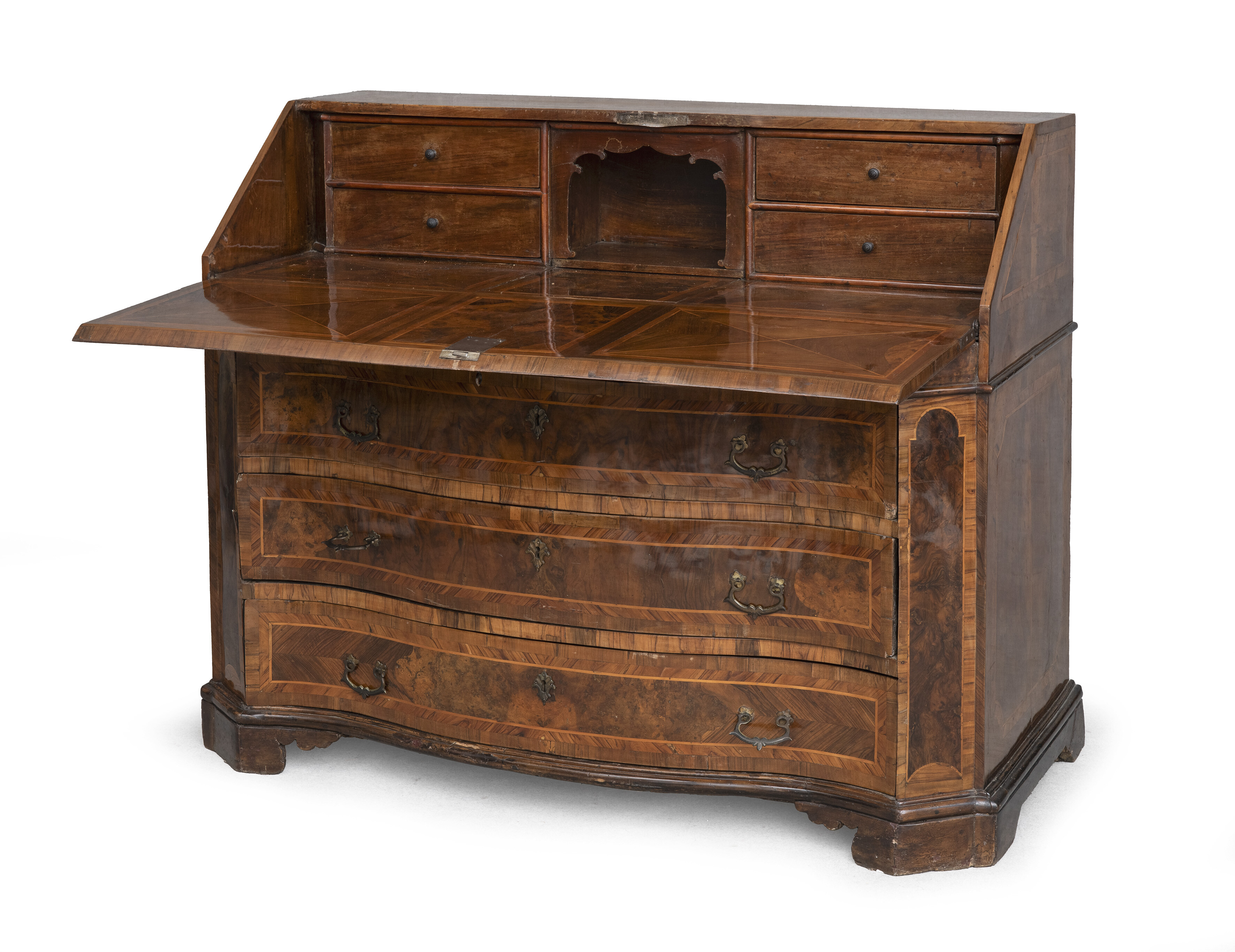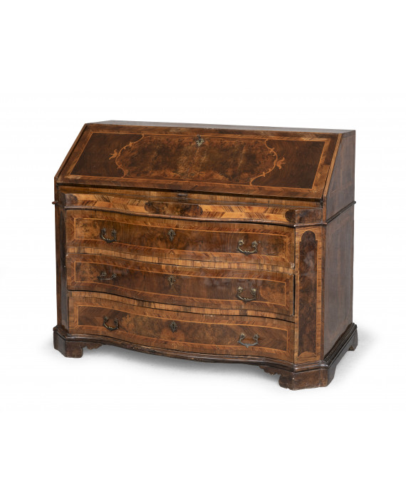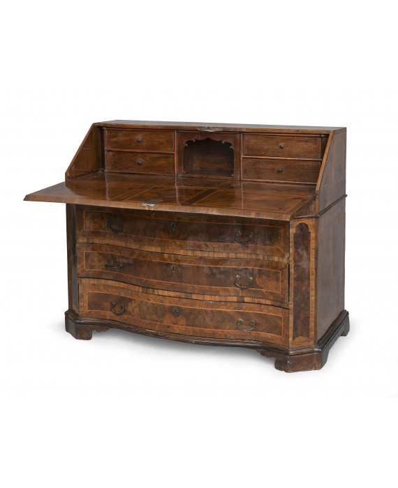 RIBALTA IN NOCE E RADICA DI NOCE, ROMA XVIII SECOLO con riserve in bosso a motivi vegetali. Interno a quattro cassetti, vano a giorno e sportello segreto. Fronte mosso a tre cassetti, piedi a mensola. Misure cm. 120 x 146 x 70. PTOVENIENZA Famiglia romana