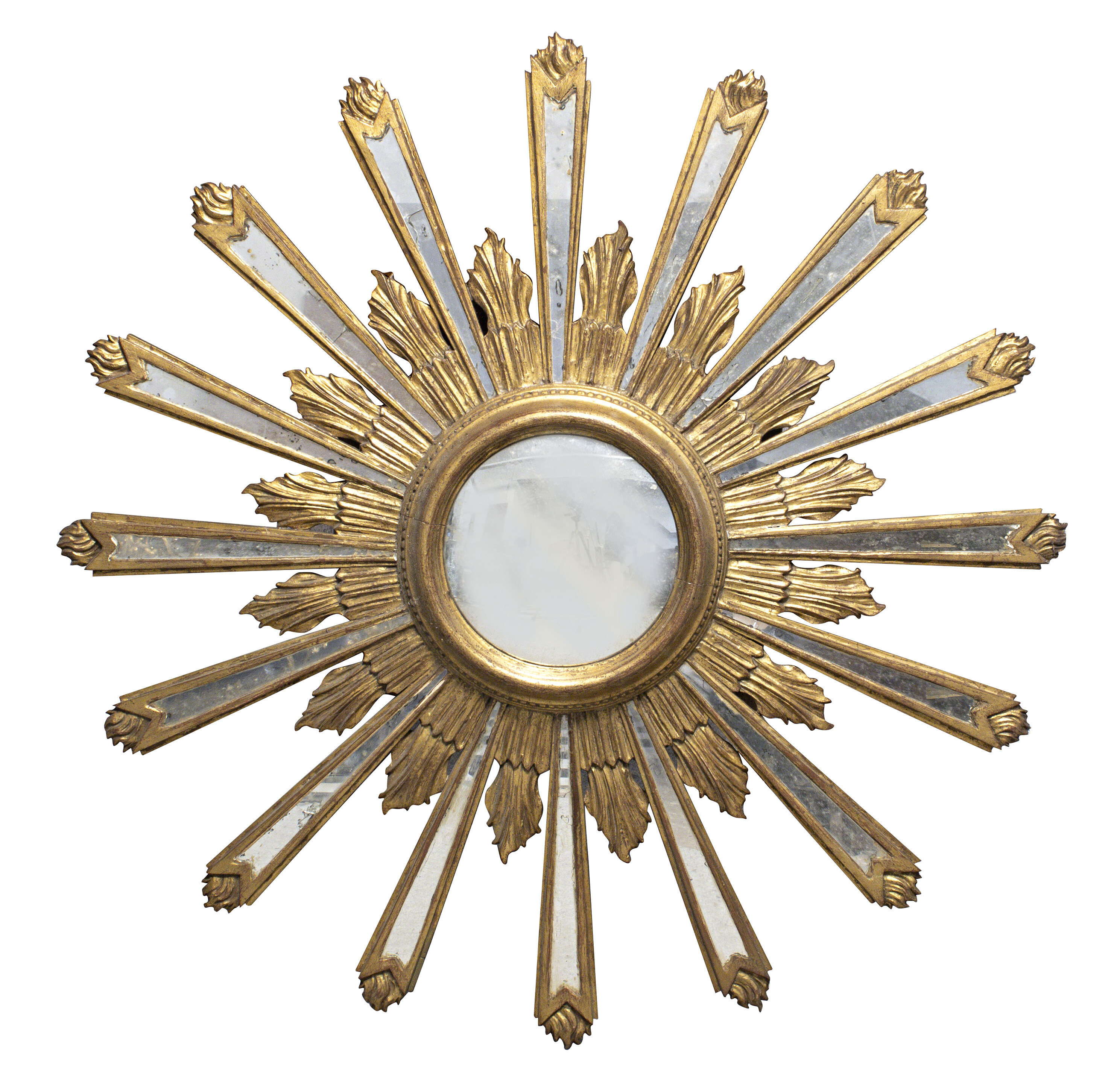 SPECCHIO A RAGGIERA IN LEGNO DORATO, XVIII SECOLO con specchi inserti ai raggi e partiture a fiammelle. Diametro cm. 87.