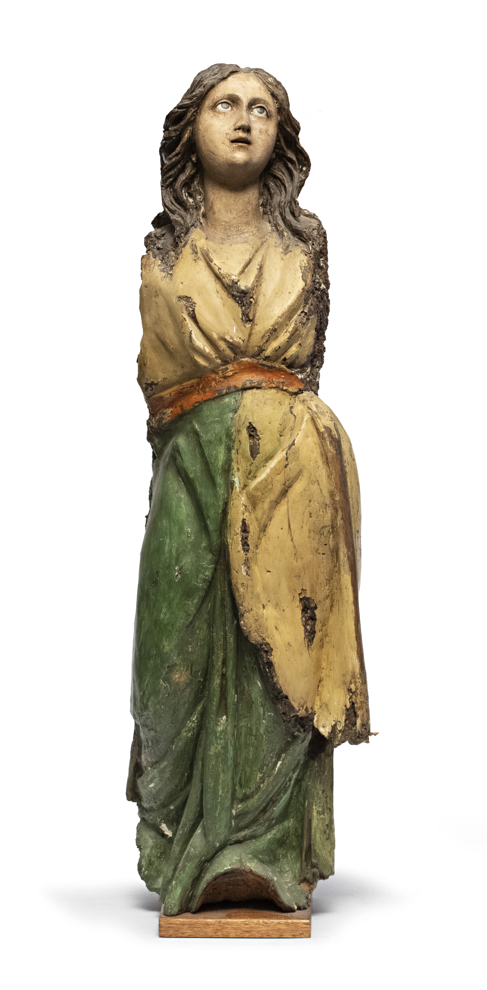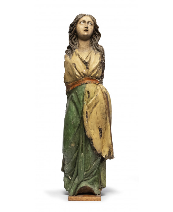 SCULTURA IN LEGNO POLICROMO, NAPOLI XVII SECOLO con occhi in vetro. Misure cm. 91 x 25 x 19. Braccia mancanti, cadute di colore. PROVENIENZA Famiglia romana