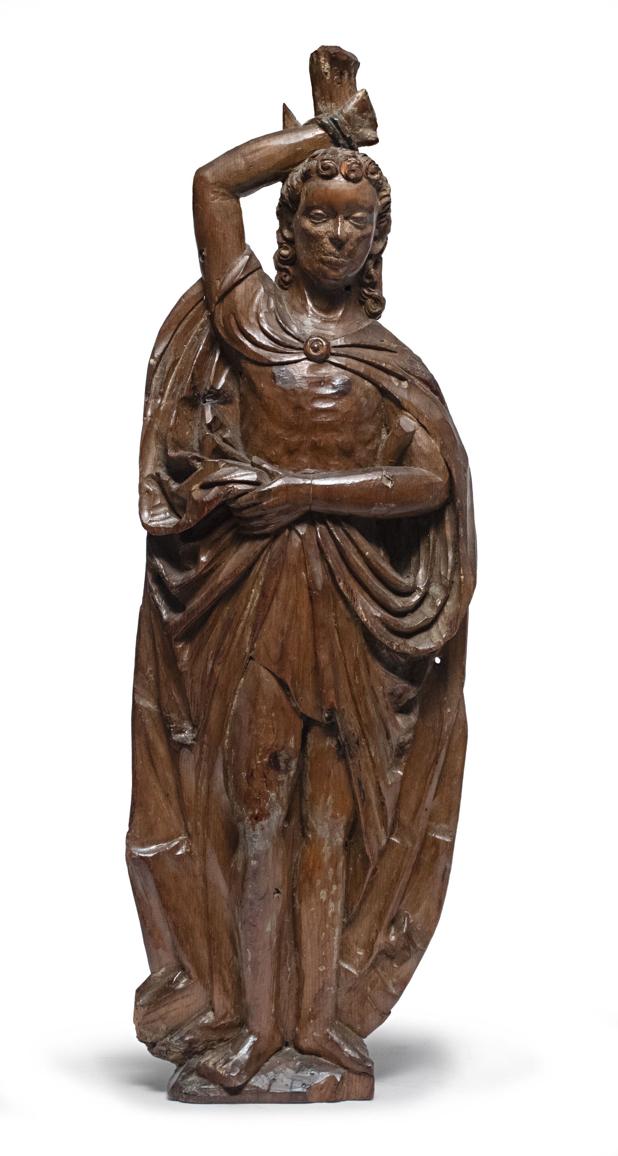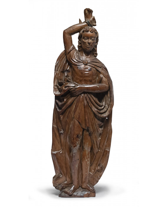 SCULTURA DA PARETE IN LEGNO, ITALIA SETTENTRIONALE XVII SECOLO raffigurante San Sebastiano. Misure cm. 88 x 27 x 8. Mano superiore mancante, sbeccature e mancanze.