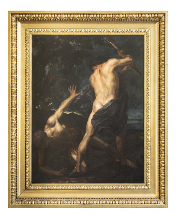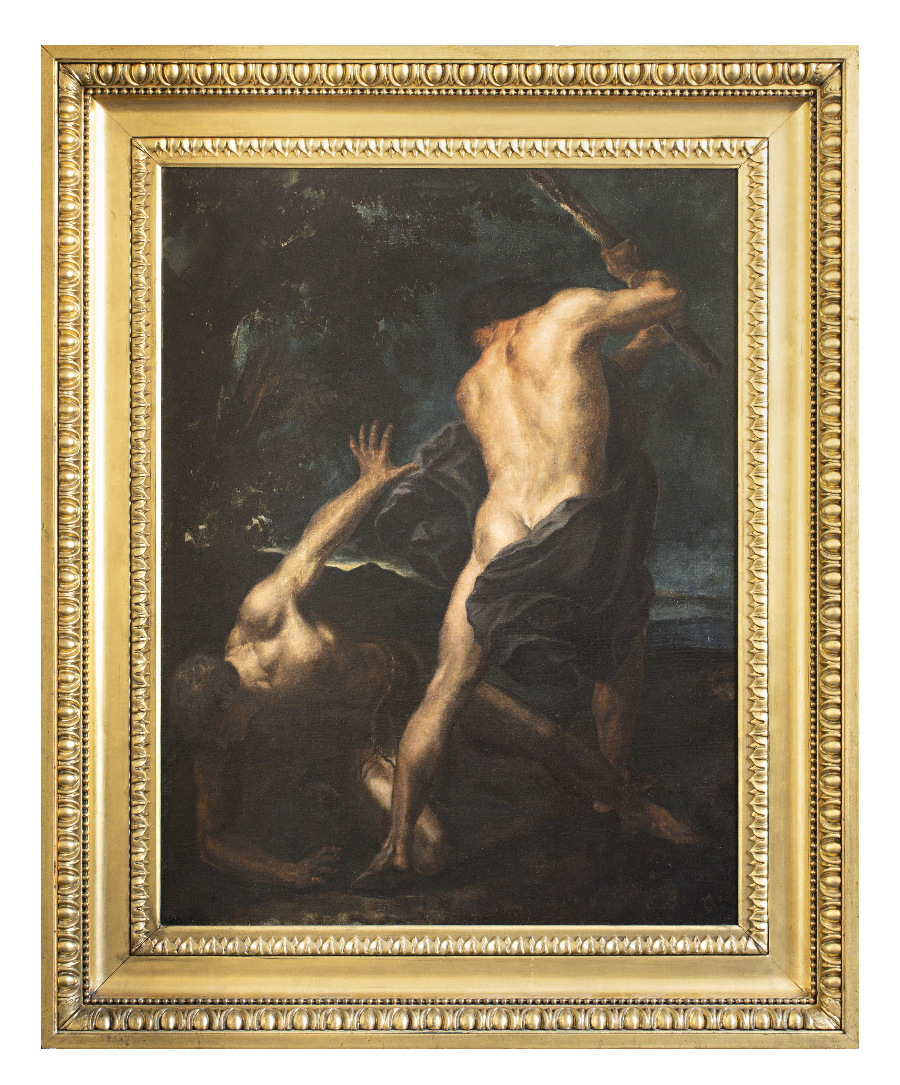 PITTORE VENETO ALLA MANIERA DEL TINTORETTO CAINO E ABELE Olio su tela, cm.79 x 60 PROVENIENZA Collezione romana CONDITION REPORT Vecchio rintelo, restauri diffusi sulle figure, sul cielo e sulle fronde degli alberi CORNICE Cornice impero a doppio ordine di intaglio recanti decori a baccelli e foglie