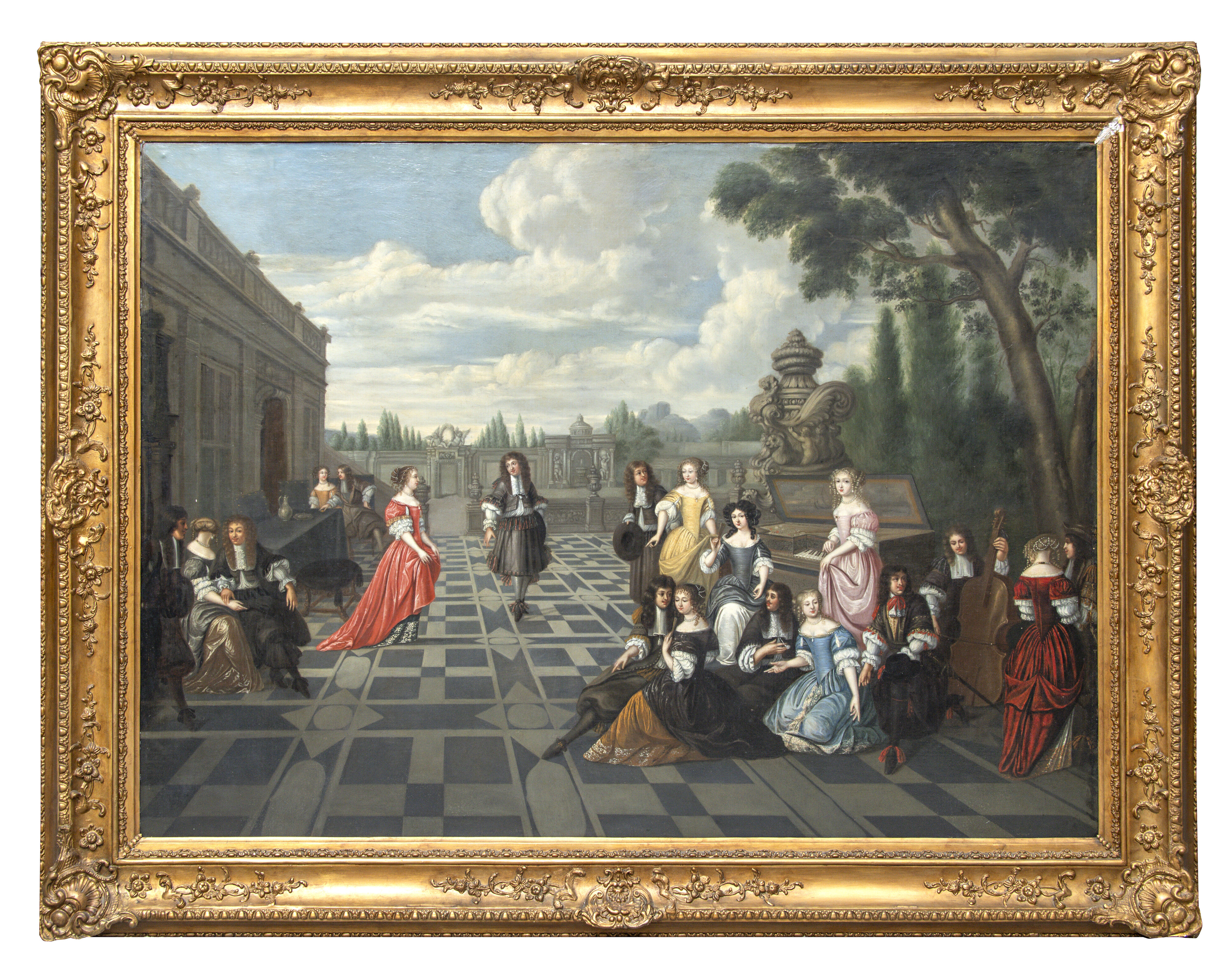 HIERONYMUS JANSSENS (Anversa 1624 - 1693) SCENA DI VITA ARISTOCRATICA IN TERRAZZA Olio su tela, 110 x 152 PROVENIENZA Famiglia romana CONDITION REPORT Rintelo ottocentesco. Alcuni punti di restauro al bordo sinistro e sul pino in alto a destra. Il dipinto è in ottimo stato di conservazione CORNICE Cornice olandese in legno e stucchi dorati con decori a motivi vegetali, del XIX secolo