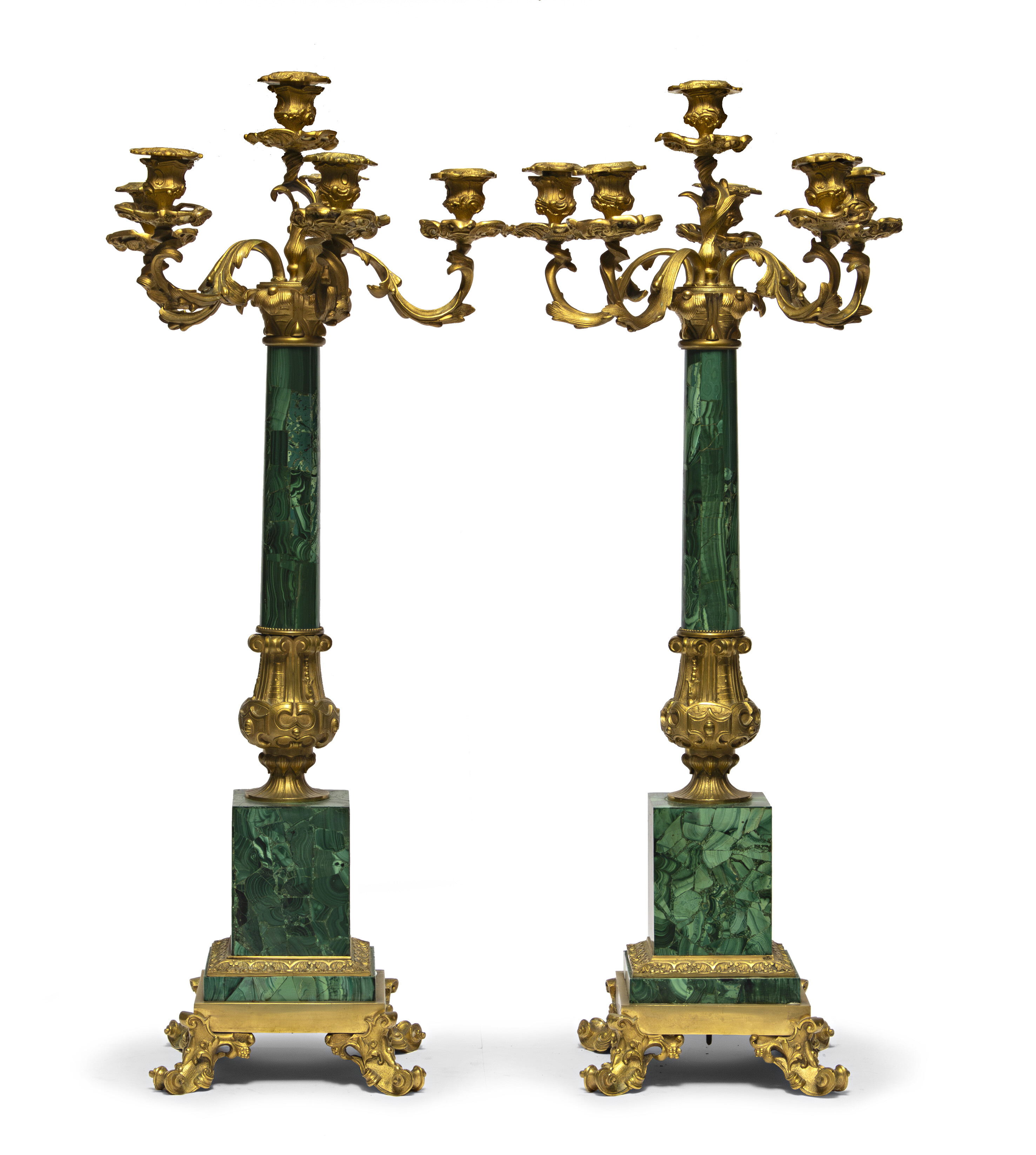 SPLENDIDA COPPIA DI CANDELABRI IN MALACHITE, RUSSIA FINE XIX SECOLO con finiture e braccia a ramages fogliate in bronzo dorato. Fusto con piede a bulbo fogliato, piedi a cartigli arricciati e fogliati. Misure cm. 84 x 36 x 36. PROVENIENZA Famiglia romana