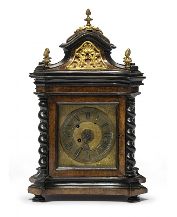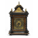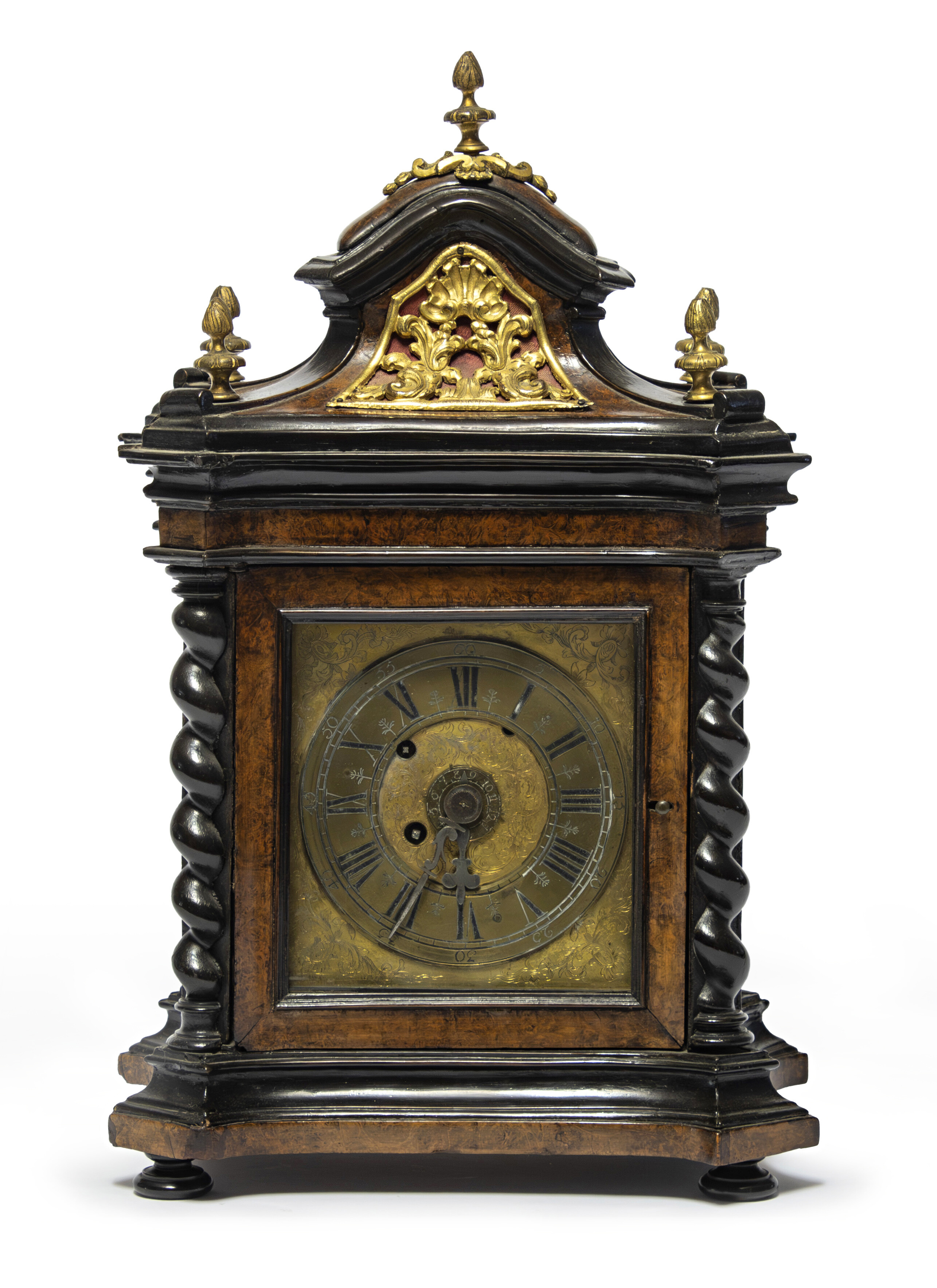 PICCOLO OROLOGIO DA TAVOLO, XVIII SECOLO con cassa in radica di tuja con finiture in ebano. Cappello guarnito da applicazioni in bronzo dorato e pinnacoli. Quadrante inciso a motivi vegetali, ad uno sportello affiancato da profili di colonne a tortiglione. Misure cm. 40 x 25 x 18. Movimento da revisionare.