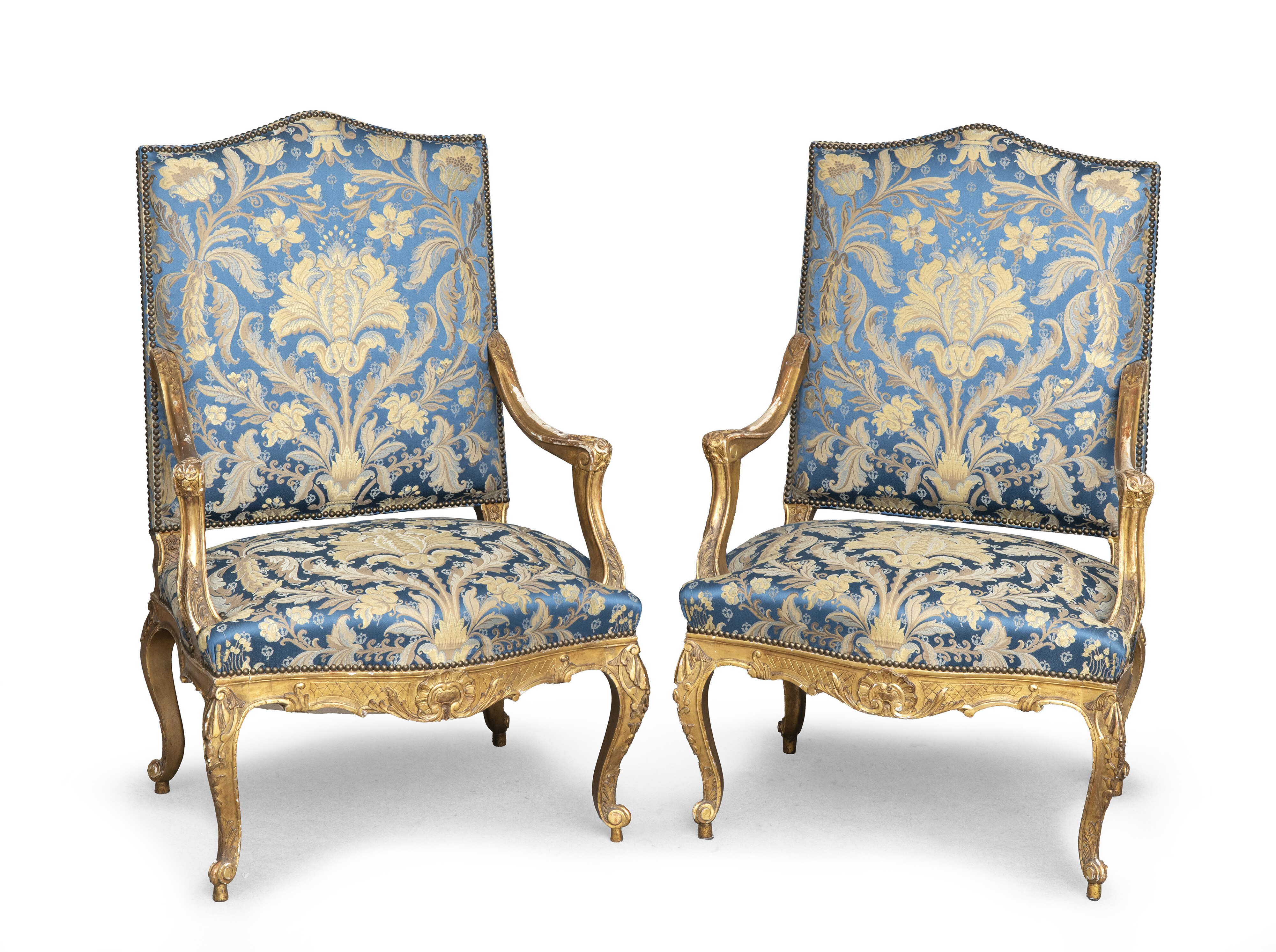 COPPIA DI POLTRONE IN LEGNO DORATO, FRANCIA XVIII SECOLO a schienale rettangolare, con intagli a motivi vegetali, Braccioli mossi, gambe arcuate. Bella tappezzeria in raso azzurro. Difetti ed usure. Misure cm. 120 x 75 x 60.