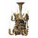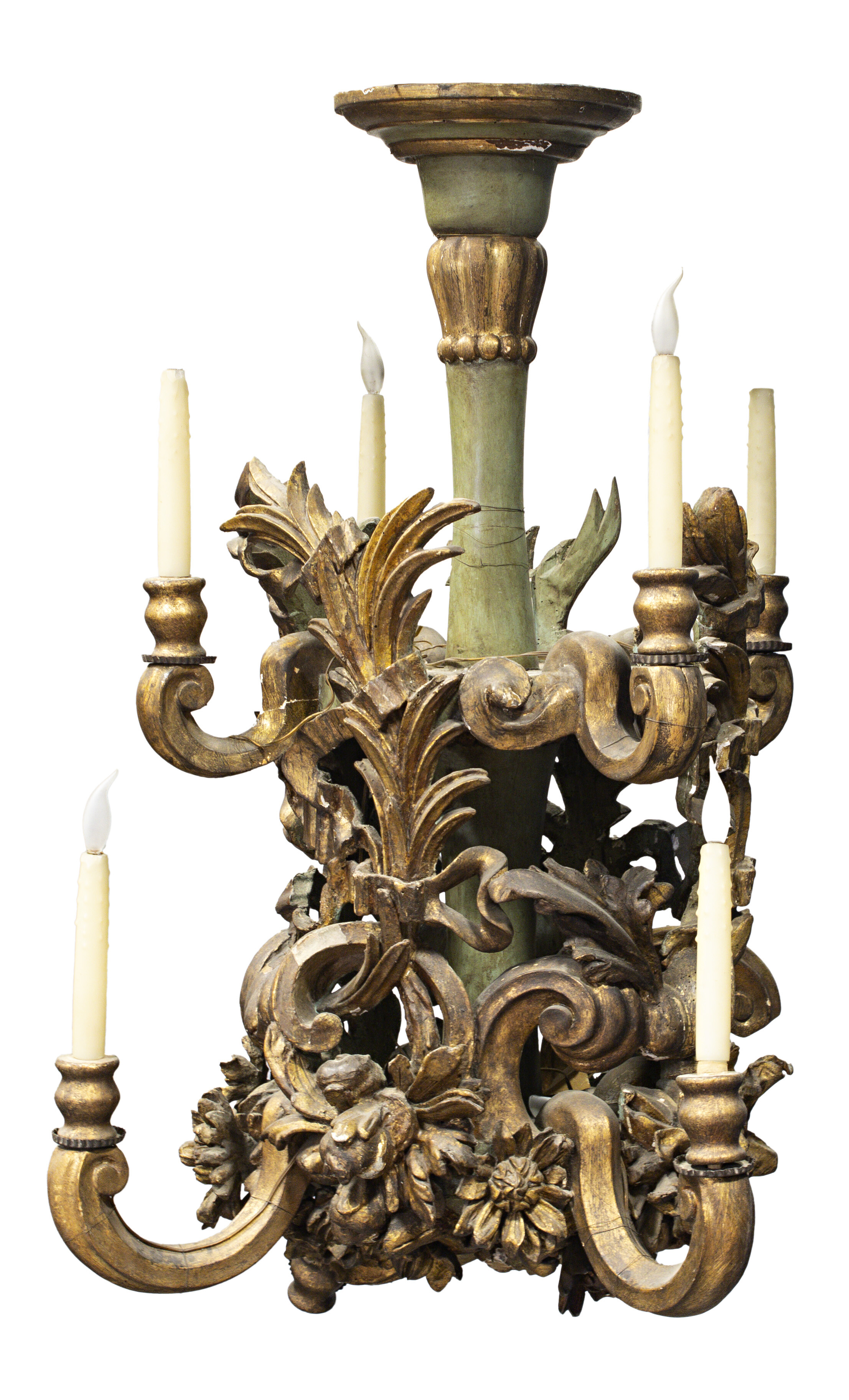 Lampadario in legno intagliato, dorato e laccato, decorato a motivi fogliacei, a otto luci. Elettrificato. Difetti e mancanze. Toscana, XVIII secolo. Misure cm. 107 x 65.