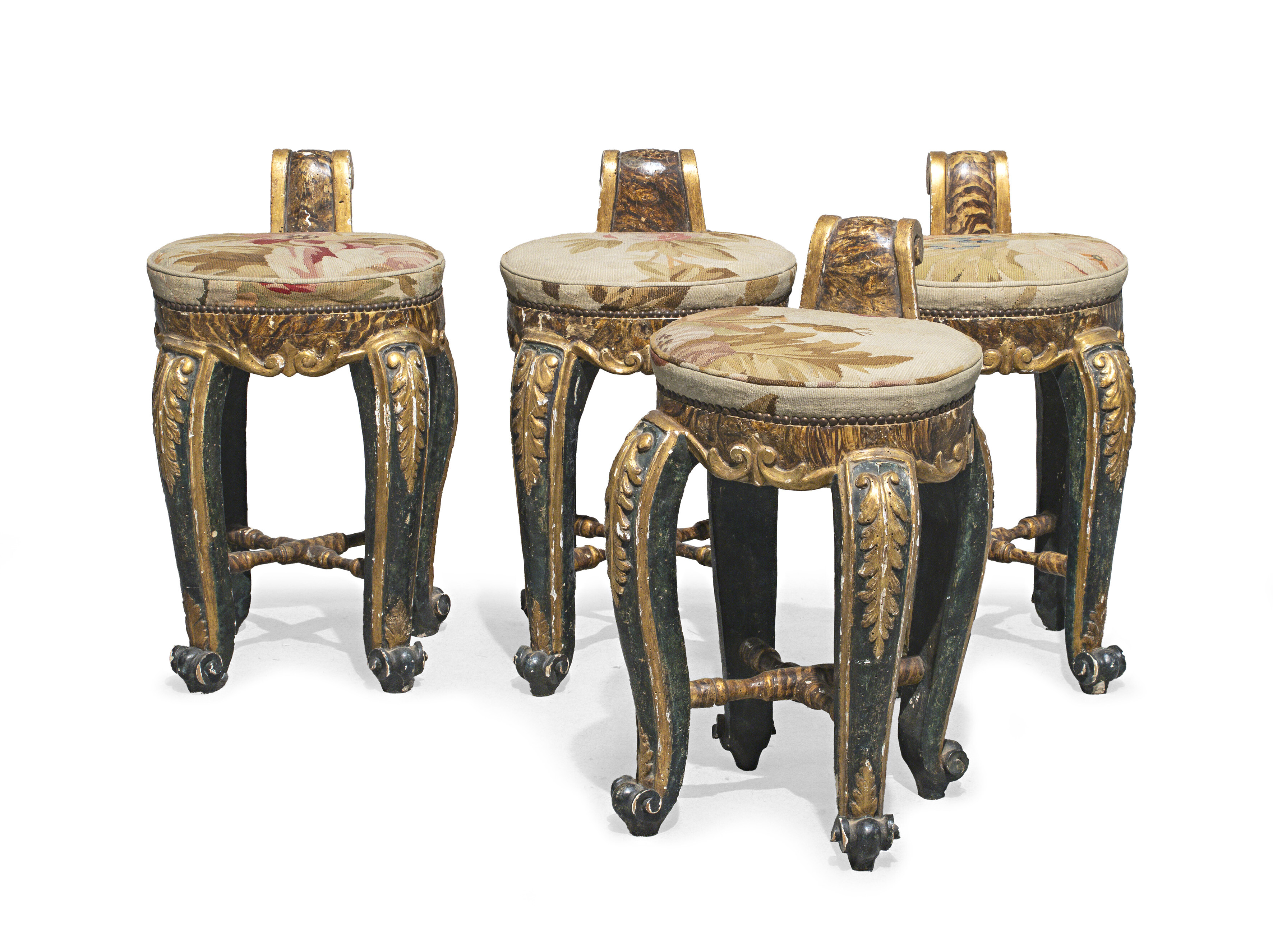 Quattro sgabelli in legno laccato e dorato, decorati a motivi floreali intagliati a rilievo. Piccolo schienale a voluta. Completi di cuscini. Toscana, XVIII secolo. Difetti e mancanze. Misure cm. 64 x 33 x 36.