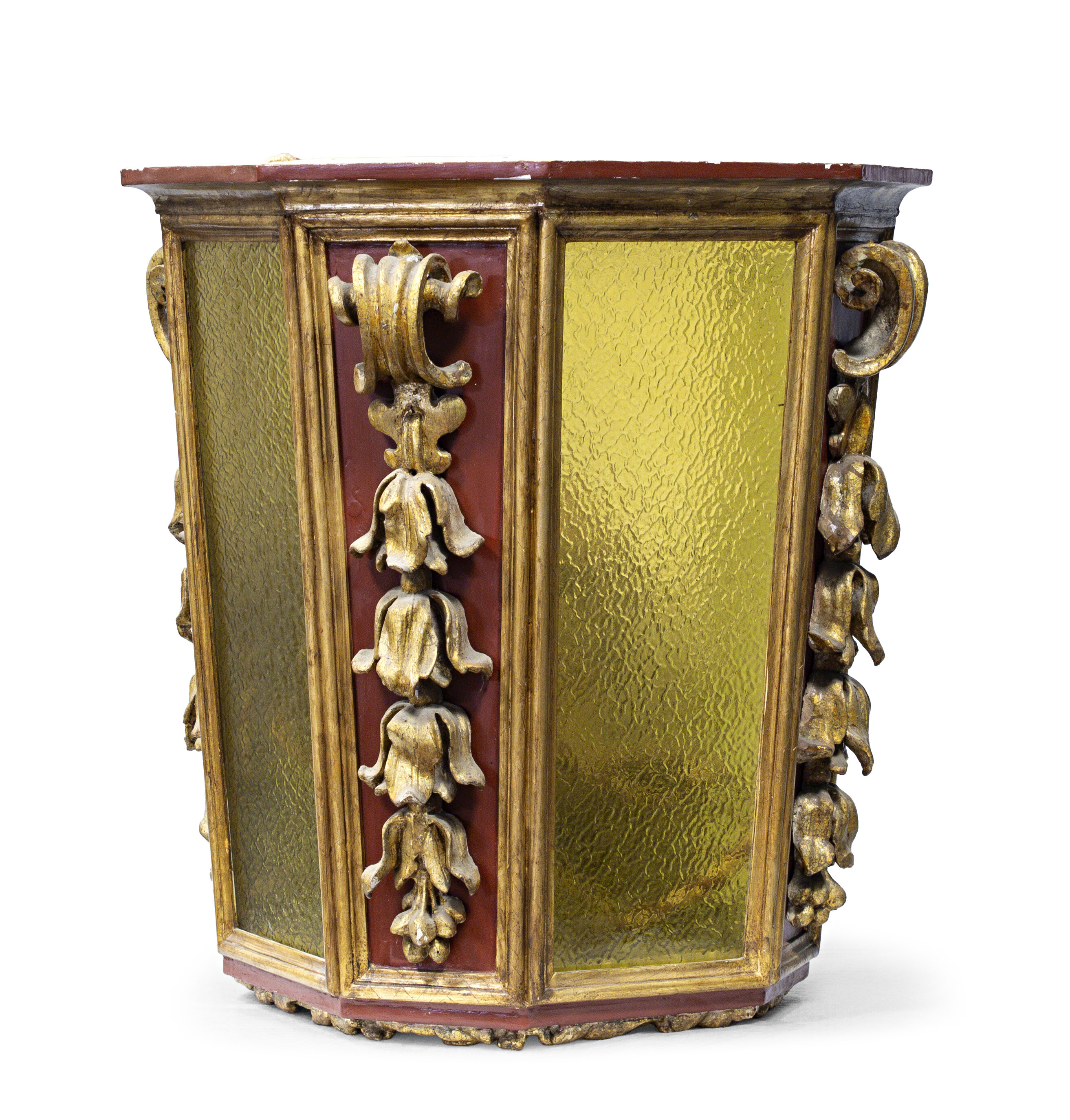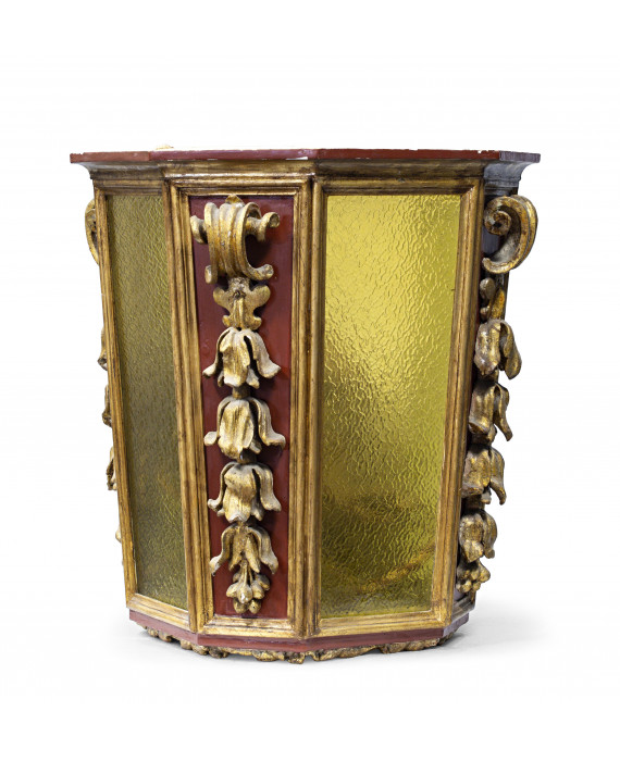 LAMPADARIO A LANTERNA TOSCANA XVIII SECOLO Lampadario a lanterna in legno dorato e laccato, con traverse laterali in vetro. Toscana, fine XVIII secolo. Elettrificato. Difetti e mancanze. Misure cm. 51 x 65.