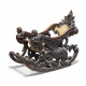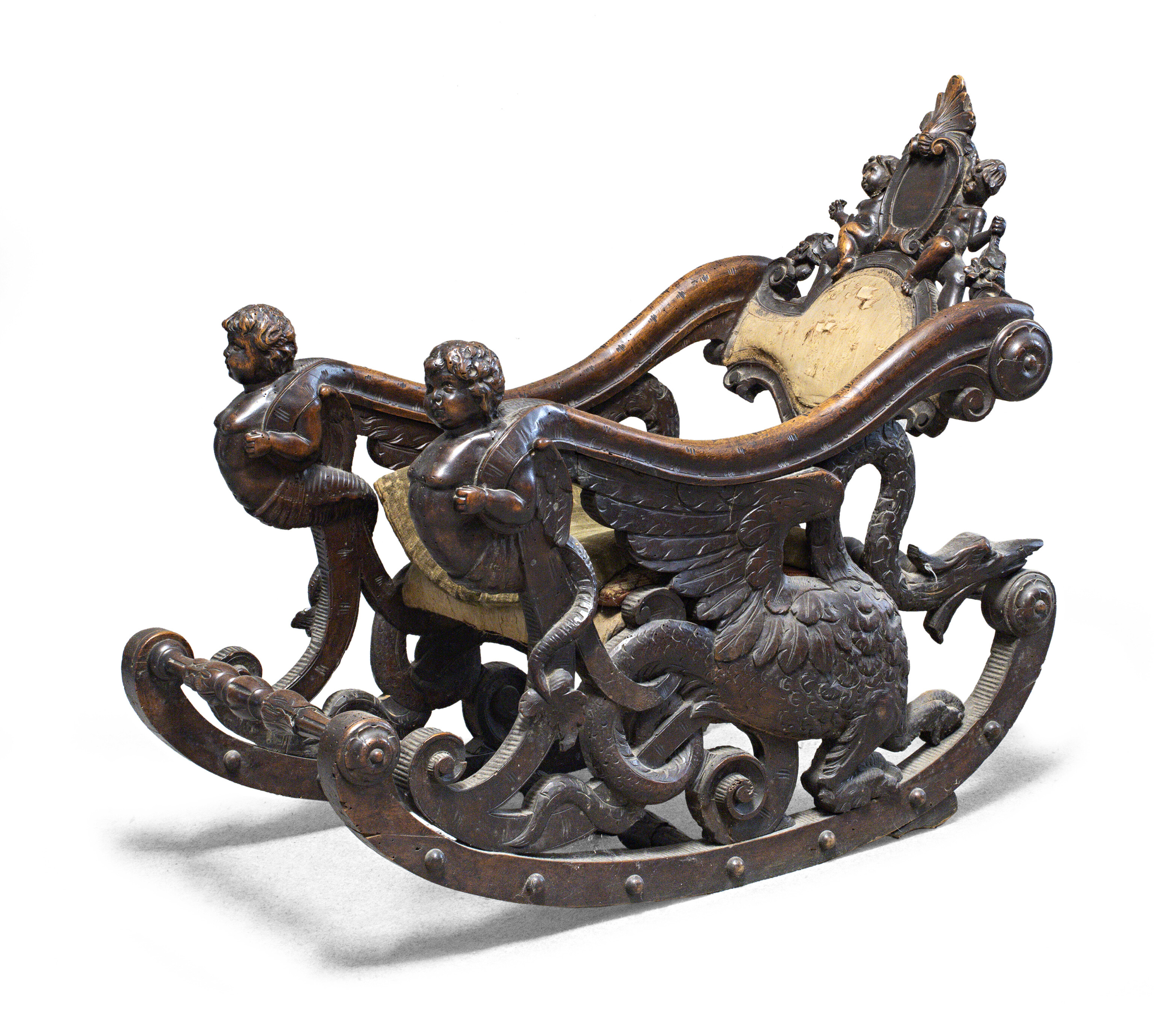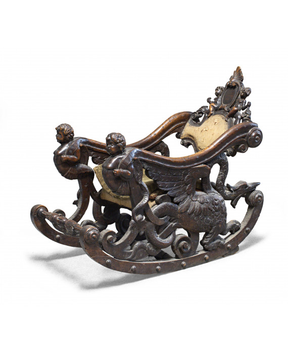 RARA POLTRONA A DONDOLO, PROBABILMENTE BRUSTOLON INIZI XVIII SECOLO interamente in noce, con schienale scolpito a stemma, motivi vegetali e amorini. Braccia curvate con apici a protomi di cherubini. Gambe a figure di cigni e volute. Misure cm. 77 x 55 x 84. Restauro, difetti.