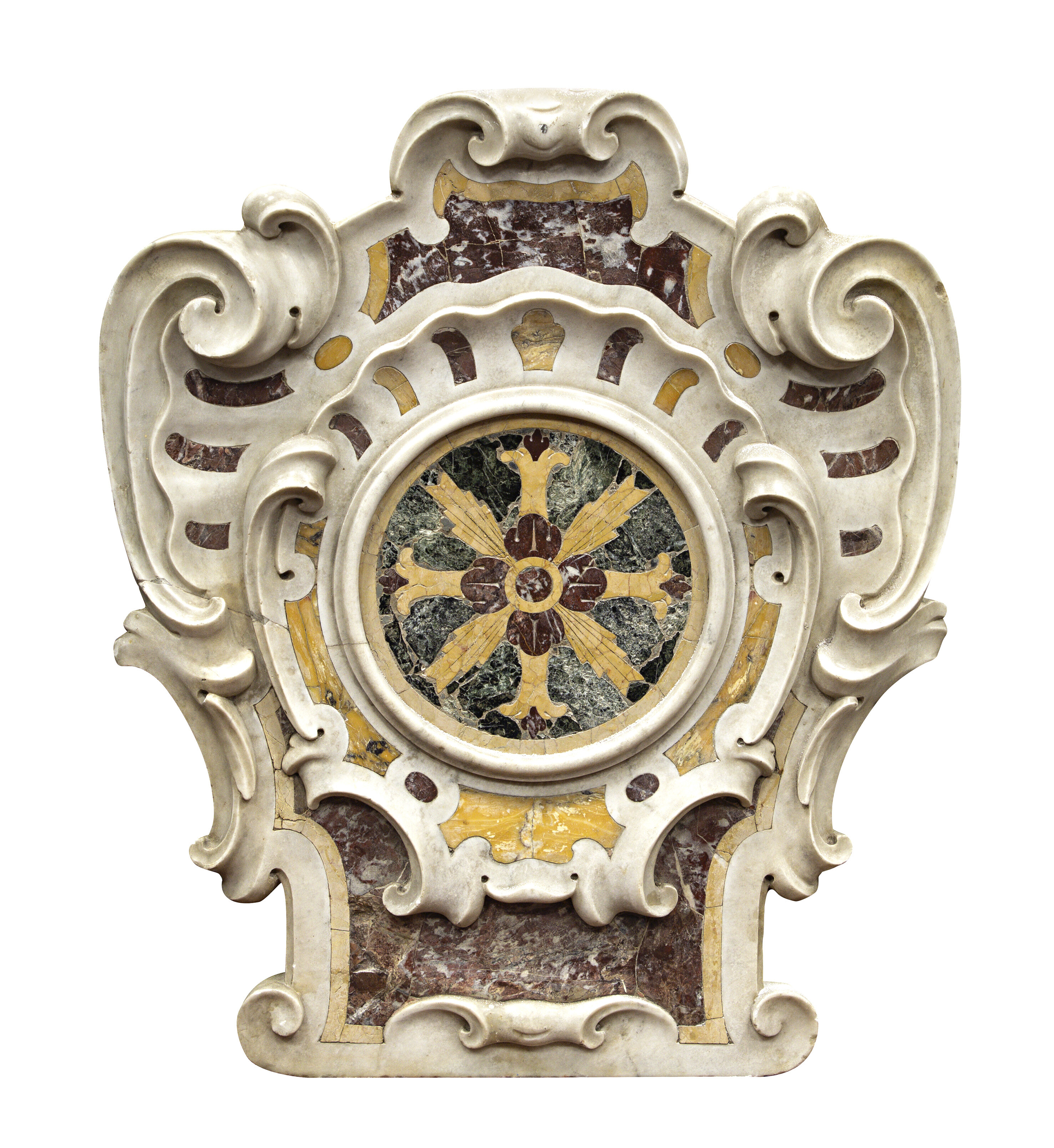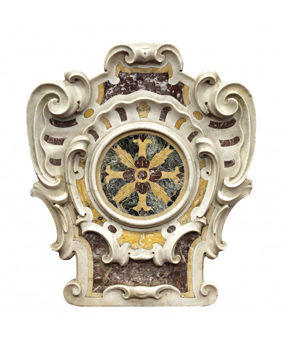 FRAMMENTO DECORATIVO IN MARMO XVIII SECOLO Frammento decorativo in marmo con intarsi in marmi colorati. Difetti. Italia meridionale, secolo XVIII. Misure cm.76x65x7.