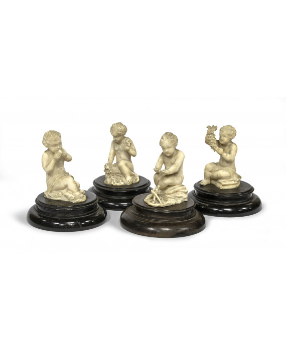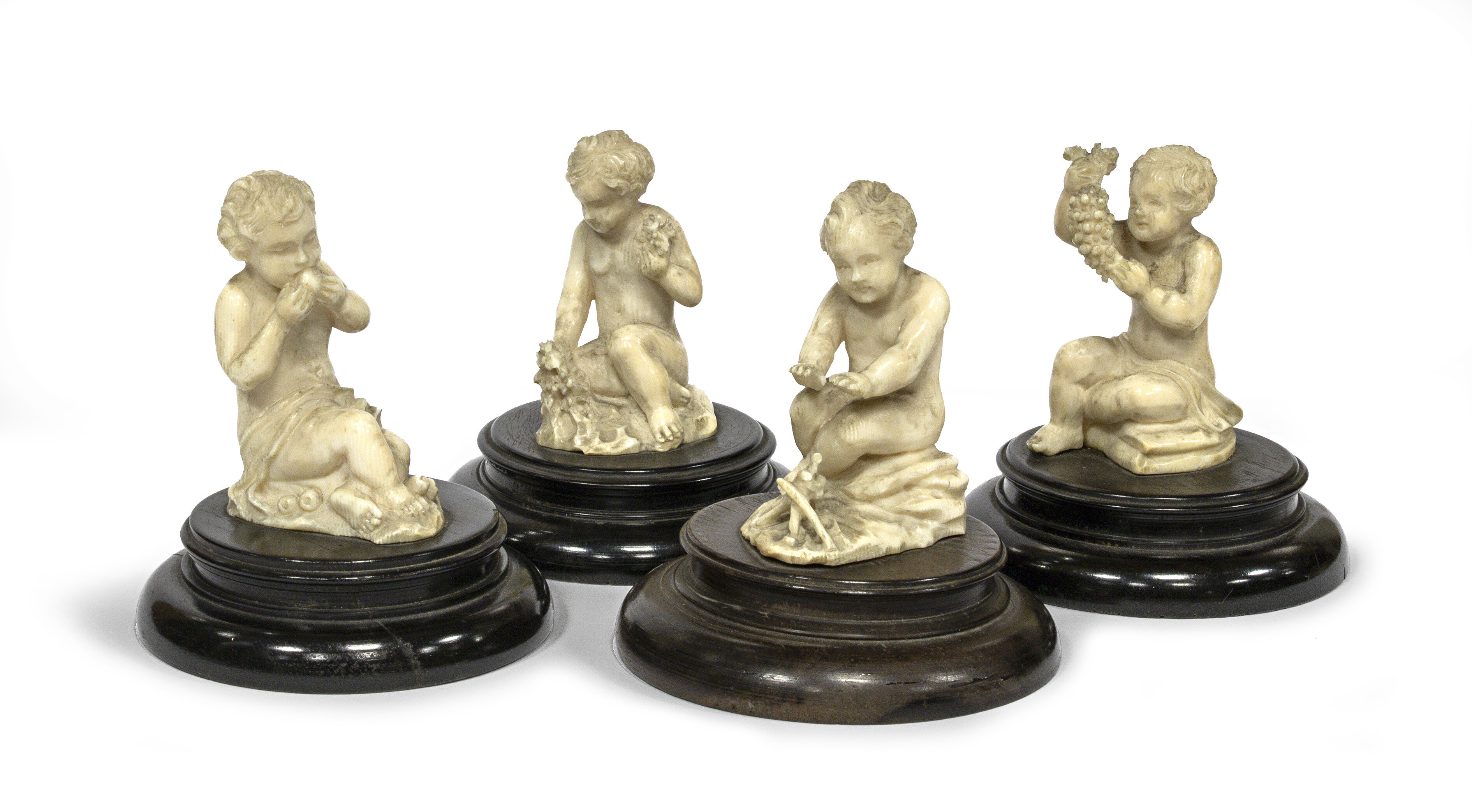 LOTTO PICCOLE SCULTURE AVORIO QUATTRO STAGIONI SECOLO XVII Lotto composto da quattro piccole sculture in avorio a tutto tondo, poggianti su base in legno ebanizzato, raffiguranti personificazioni allegoriche delle quattro stagioni. Misure alt.cm 9. (base inclusa) Lotto accompagnato da certificazione CITES
