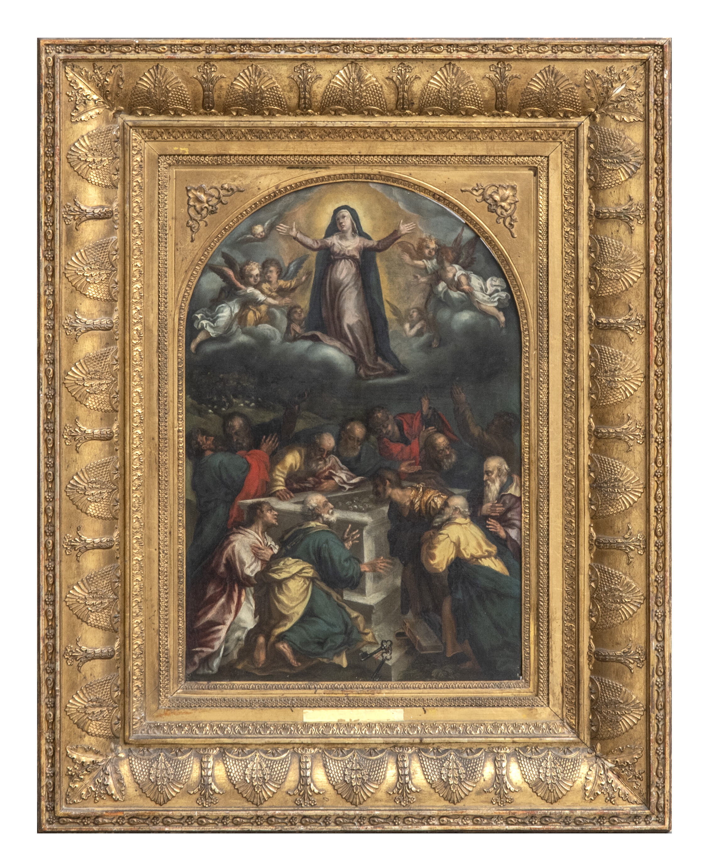 HANS ROTTENHAMMER, ambito di (Monaco di Baviera 1564 - Augusta 1625) ASSUNZIONE DELLA VERGINE Olio su rame centinato, cm. 50 x 31,5 PROVENIENZA Famiglia romana CONDITION REPORT Rame di alto spessore. Una piccola zona di restauro sulla destra, punti di restauro ossidati. Il dipinto è in buono stato di conservazione CORNICE Cornice a volta in legno dorato con decori a palmette e foglie, del periodo impero (mancanza)